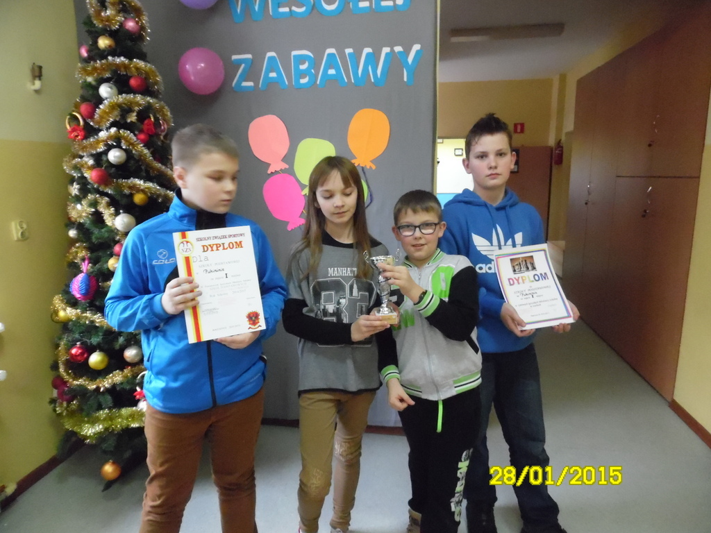 W dniu 28 stycznia 2015 r. uczniowie naszej szkoły uczestniczyli w Powiatowych Igrzyskach Młodzieży Szkolnej Szkół Podstawowych w szachach drużynowych w ZSO Boguszycach. Drużyna składająca się z czterech uczniów: Katarzyny Rochmińskiej, Mikołaja Misztala, Szymona Jaśkiewicza i Krzysztofa Kłosa, zajęła I miejsce. GRATULUJEMY!