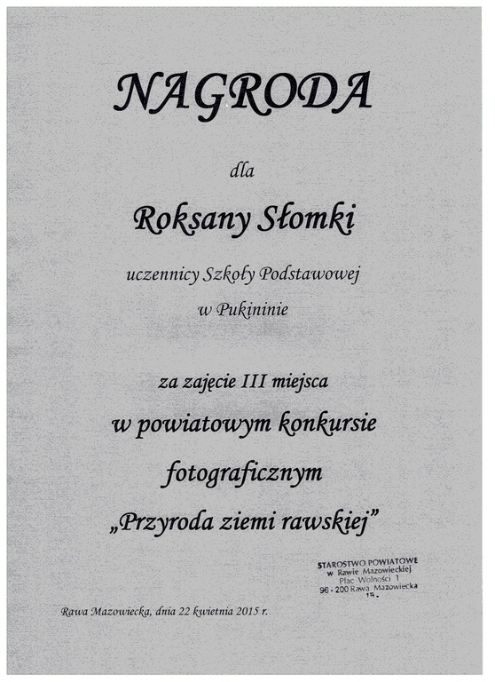 22 kwietnia rozstrzygnięty został powiatowy konkurs fotograficzny "Przyroda ziemi rawskiej" organizowany przez Odział Ligi Ochrony Przyrody w Rawie Mazowieckiej. Udział w konkursie wzięło ponad 100 ucznów w różnych kategoriach wiekowych, wpłynęło do komisji konkursowej ponad 300 zdjęć. Uczennica naszej szkoły, Słomka Roksana zajęła III miejsce w kategorii klas IV - VI. GRATULUJEMY!