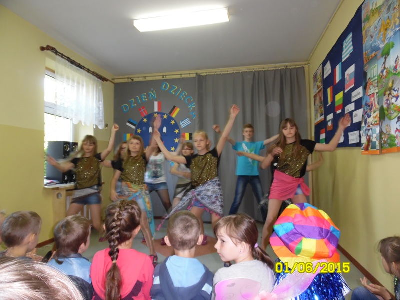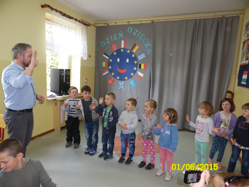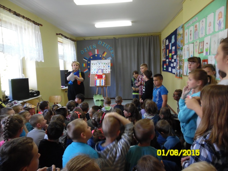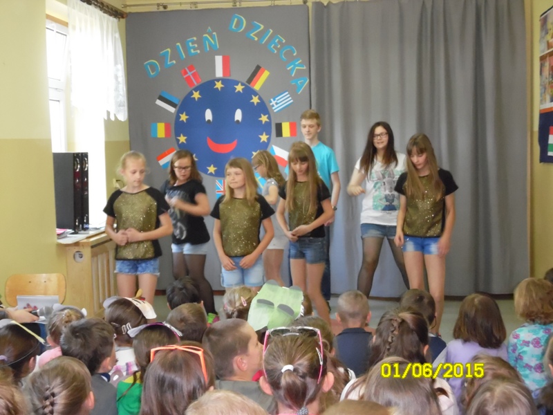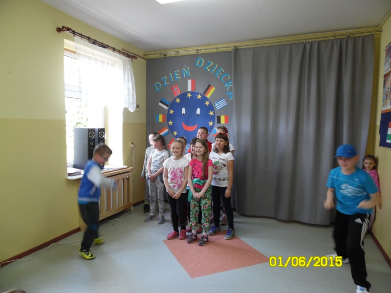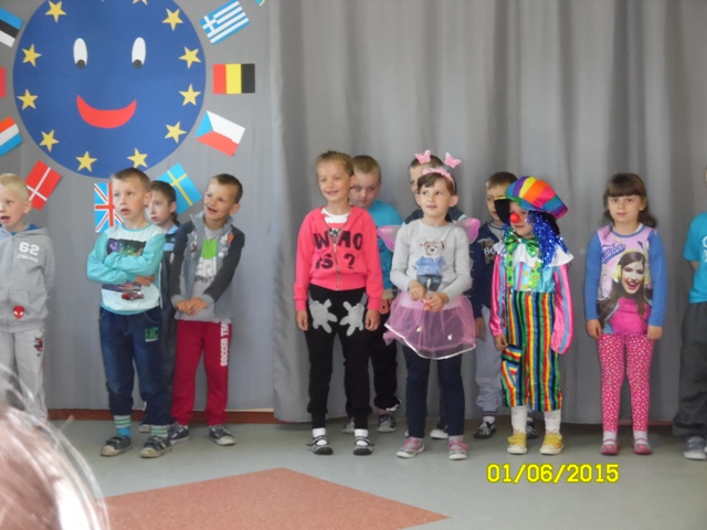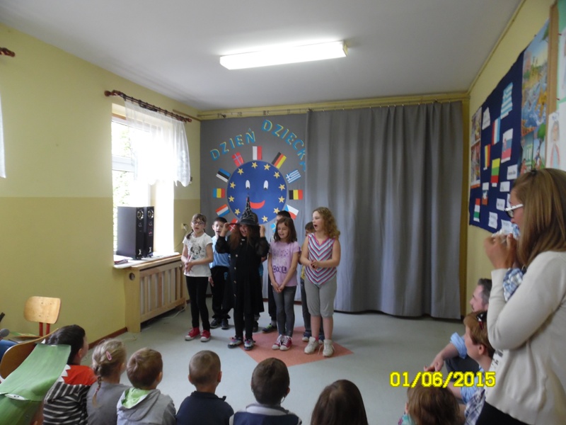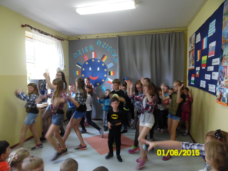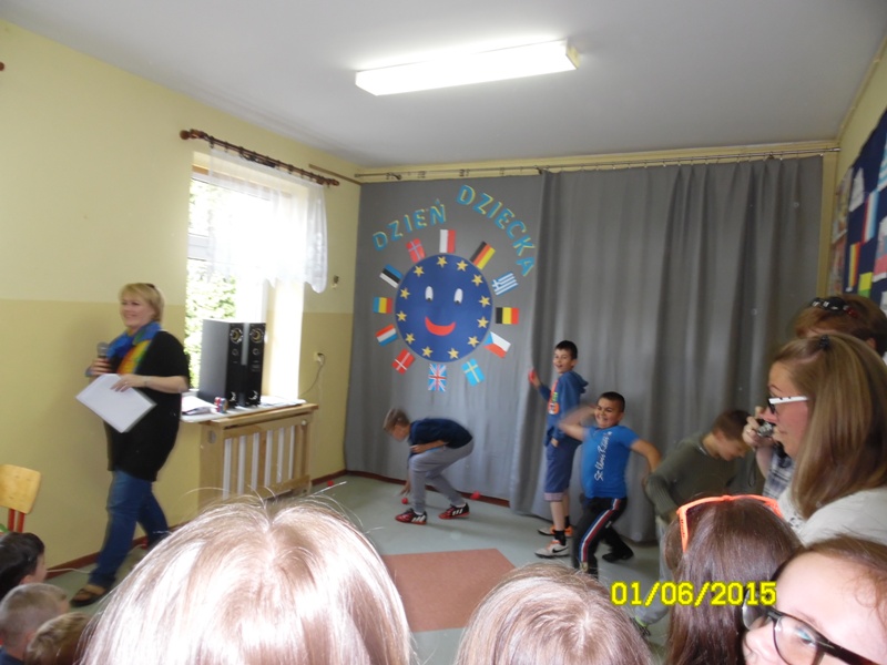 O samego rana dzieci uczestniczyły w Międzynarodowym Dniu Języków Obcych, którego obchody przygotowała pani Agnieszka Włostowska, nauczycielka języka angielskiego wraz z uczniami klas IV-VI. Dzieci z klas 0-III śpiewały po angielsku, natomiast uczennice klasy V zaśpiewały piosenki w języku francuskim i hiszpańskim. Odbyła się również próba zaśpiewania „Panie Janie” po angielsku, niemiecku, czesku i włosku. Dziewczęta z klasy V zaprezentowały kilka układów tanecznych do znanych przebojów, m.in. „Makarena” czy „Grek Zorba”, a kilkoro uczniów klasy IV odtańczyło corridę! Uczniowie klasy VI wykonali i pokazali wizytówki wybranych krajów europejskich: Włoch, Niemiec, Grecji, Rosji oraz dali próbkę rozmówek w językach tych krajów. W międzyczasie dzieci brały udział w konkursach dotyczących: znajomości flag krajów europejskich, rozpoznawania odgłosów zwierząt i nazywania ich w języku angielskim, rozpoznawania słowa „dziękuję” w różnych językach. Za poprawne odpowiedzi otrzymywały kartoniki, które później wymieniły na nagrody.