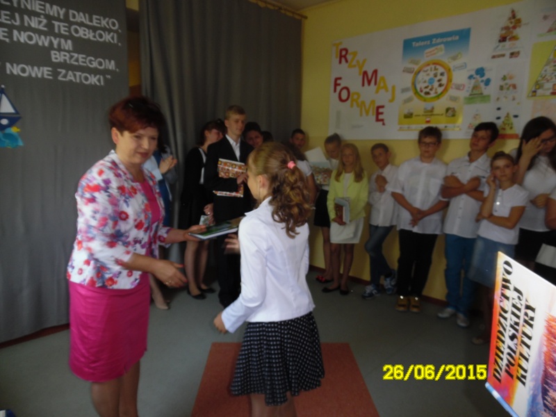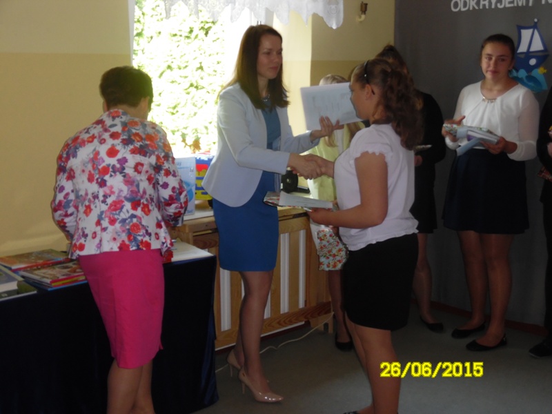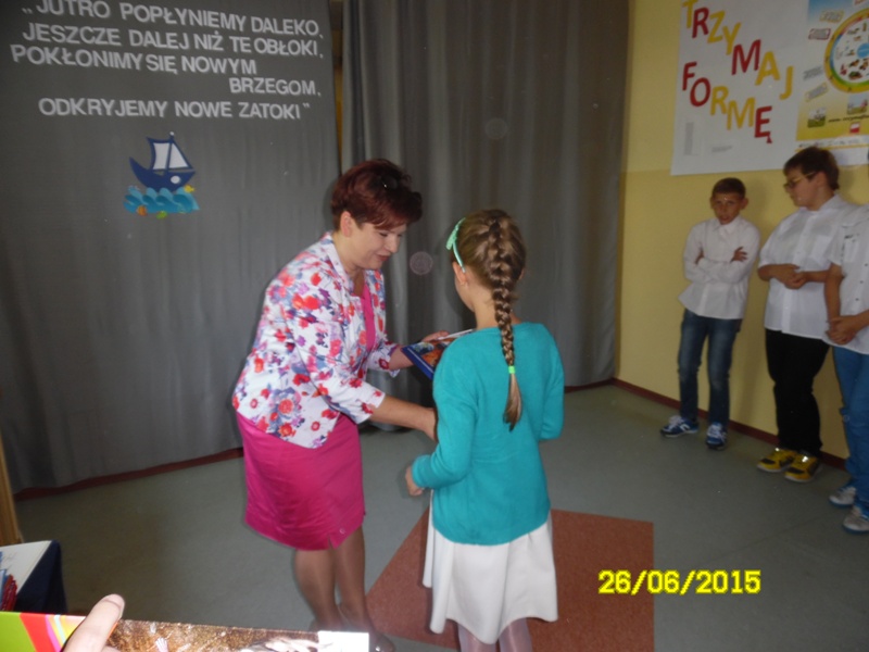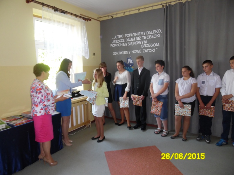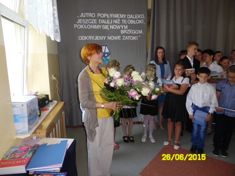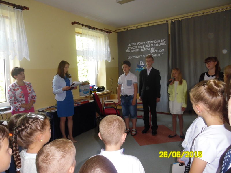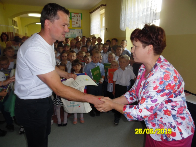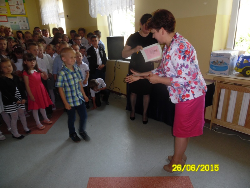Po części artystycznej uczniowie klasy szóstej otrzymali świadectwa, zaświadczenia o wynikach sprawdzianu oraz nagrody książkowe za wysokie wyniki w nauce oraz za 100% frekwencję. Fala tłumionych uczuć znalazła wreszcie ujście w postaci łez nieskrywanych przez absolwentów. Nagrody książkowe zostały również wręczone uczniom klas I-V, a przedszkolakom – pamiątkowe dyplomy. Uroczystość zakończenia roku przebiegła w bardzo wzruszającej atmosferze.