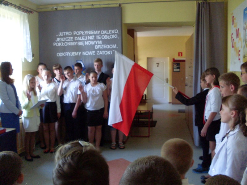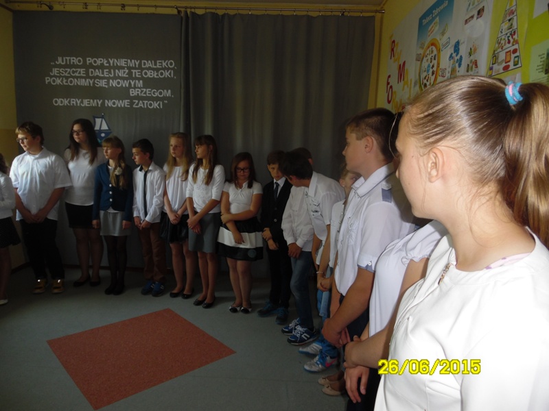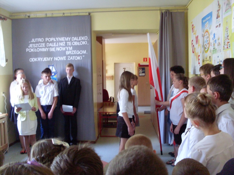 Reprezentacja uczniów klasy szóstej po raz ostatni wprowadzili sztandar szkoły. Wszyscy wspólnie odśpiewali hymn, a potem nastąpiło przekazanie sztandaru szkoły reprezentacji klasy piątej.
