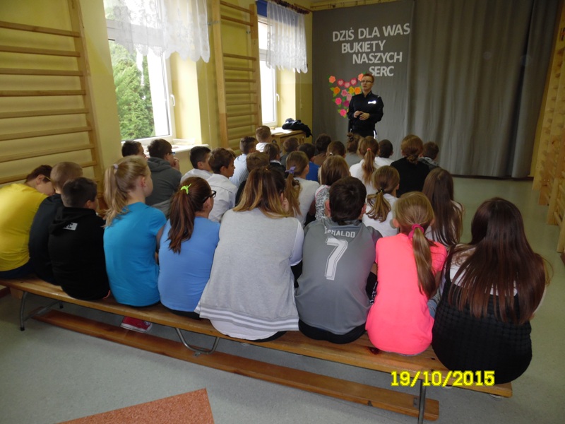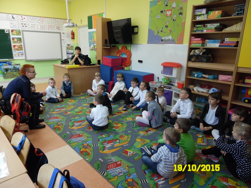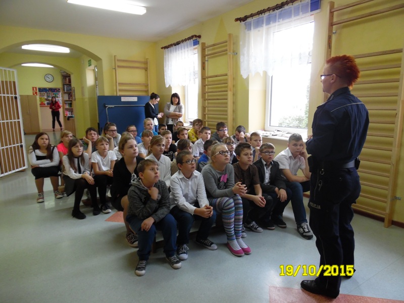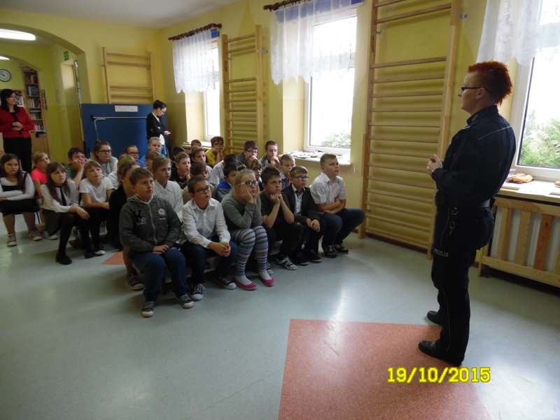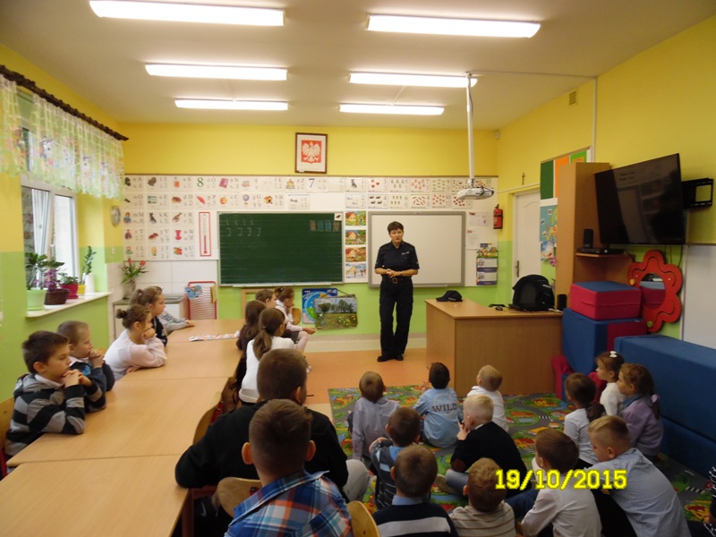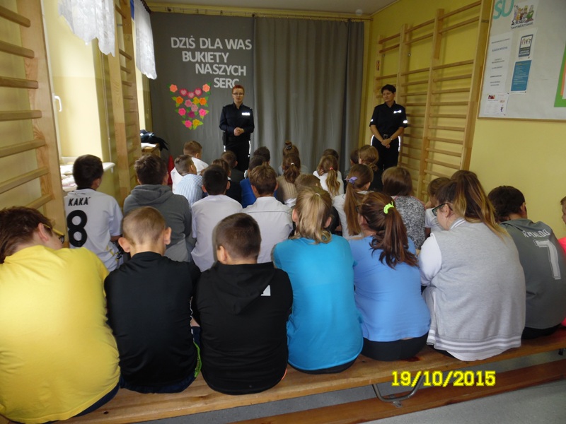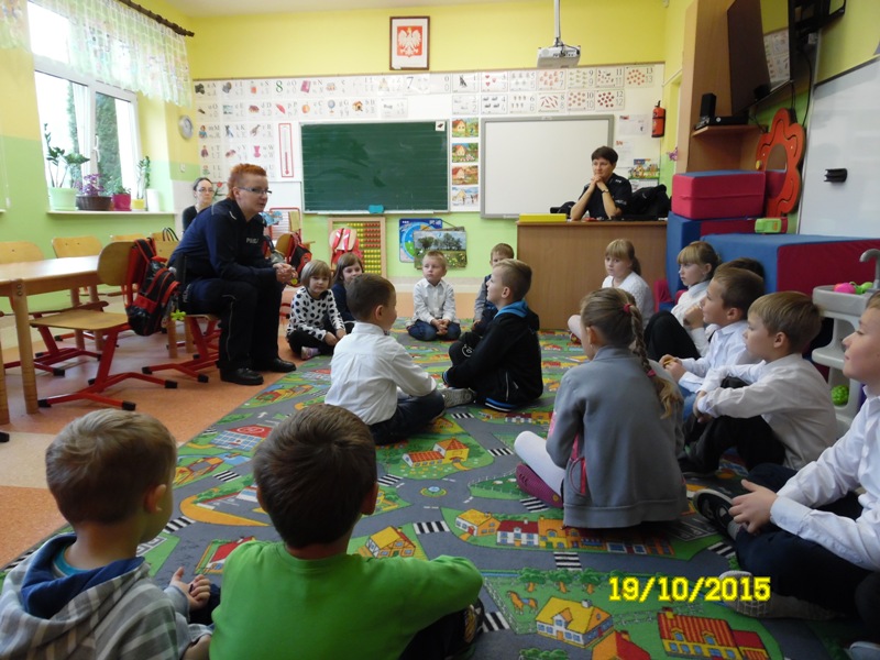 W dniu 19.10.2015 odbyło się spotkanie uczniów klas 0 - III i IV - VI z przedstawicielami Komendy Policji: Karoliną Sokołowską i Malgorzatą Lewandowską. Omówione zostały zagadnienia dotyczące: