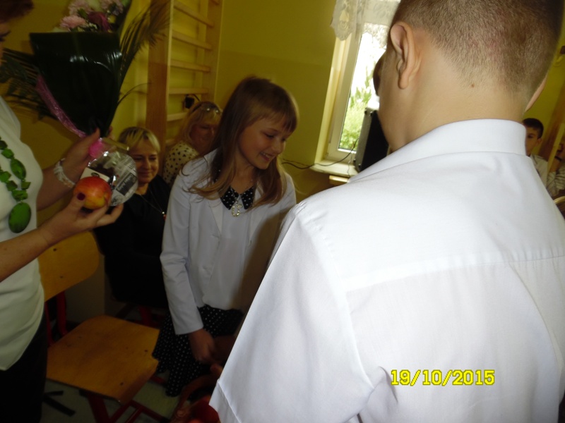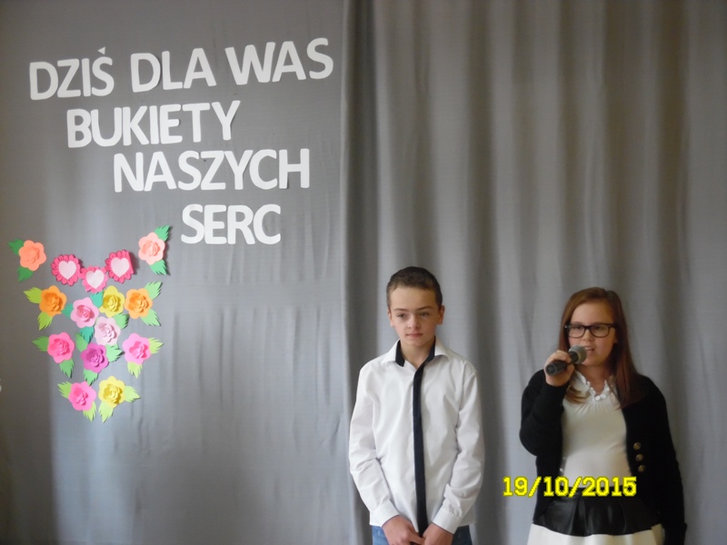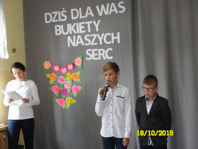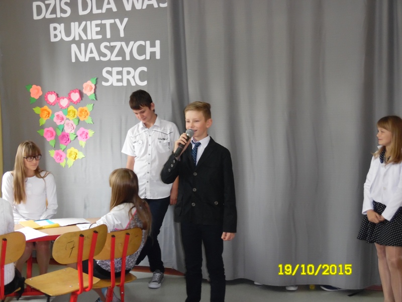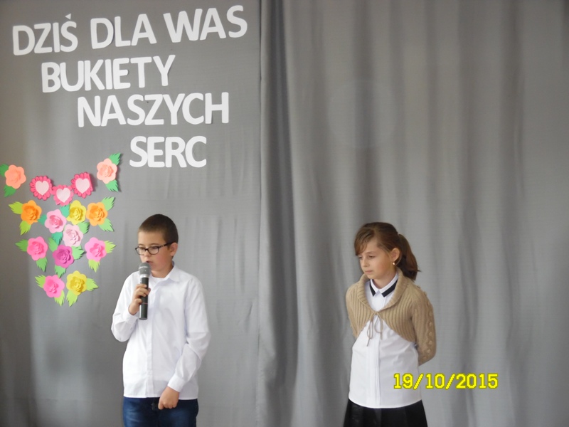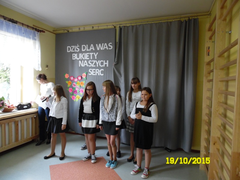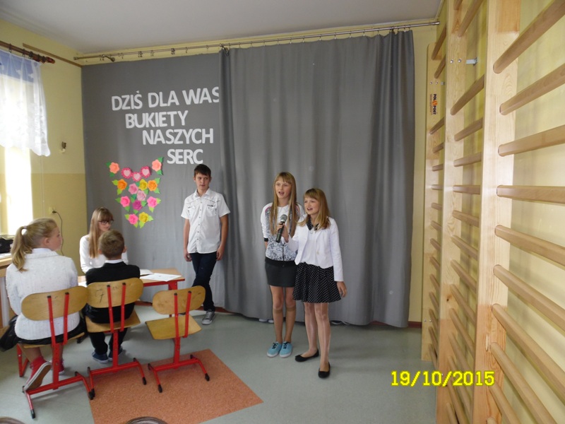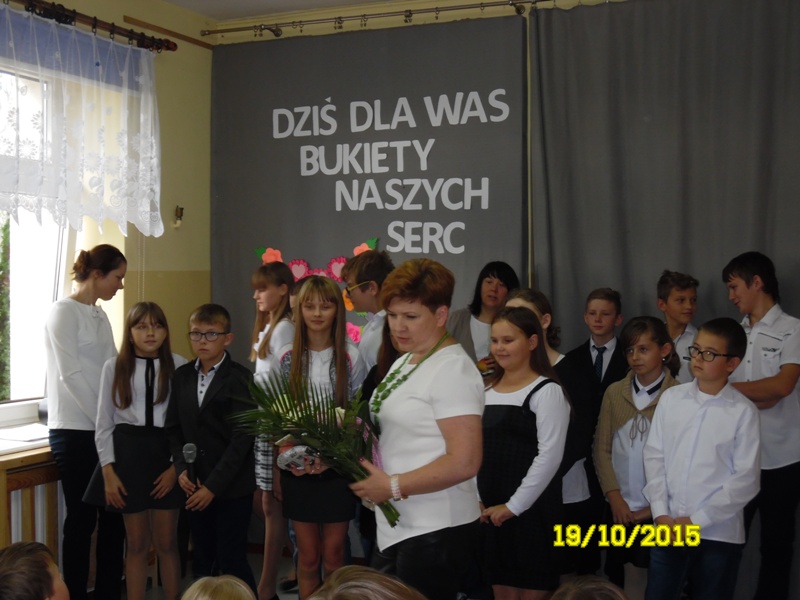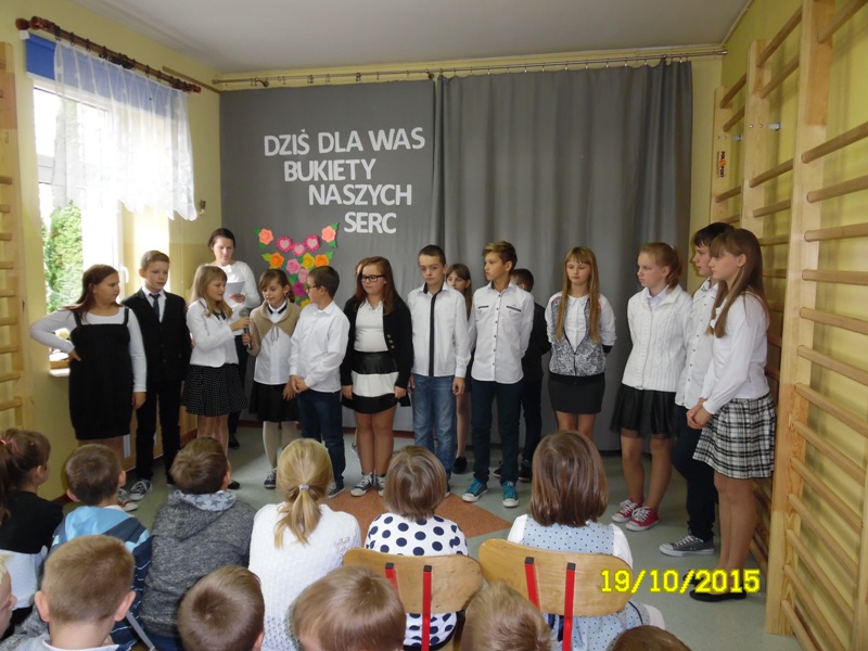 Uczniowie klas IV-VI pod opieką p. R. Maciejewskiej i E. Klimczak przygotowali i zaprezentowali montaż słowno-muzyczny poświęcony tym, którzy pracują w szkole. Były wiersze pełne słów wdzięczności, wesołe, optymistyczne piosenki oraz scenka humorystycznie ukazująca zmagania uczniów, którzy nie garną się do nauki i nauczycielki, która chce za wszelką cenę czegoś ich nauczyć. Na zakończenie uroczystości pani dyrektor L. Błaszczyk złożyła życzenia wszystkim nauczycielom i pracownikom szkoły.