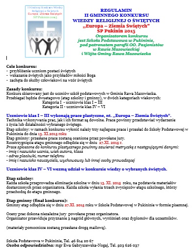 Zapraszam do udziału w II GMINNYM KONKURSIE WIEDZY RELIGIJNEJ O ŚWIĘTYCH ,,Europa - Ziemia Świętych".