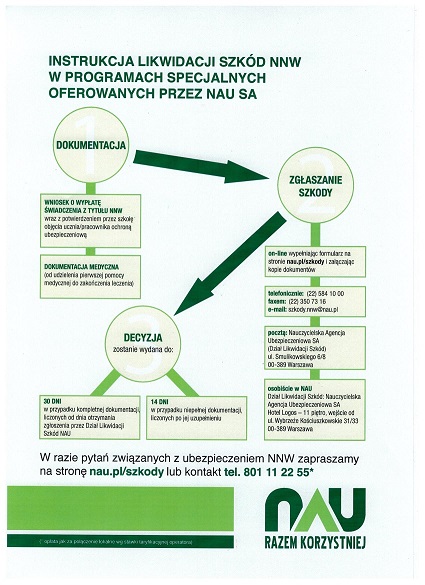 Program ubezpieczenia NAU, negocjowany jest na wyłączność z najlepszymi Towarzystwami Ubezpieczeniowymi, jako Oferta Specjalna. Powstaje na bazie szczegółowej analizy wypłacanych świadczeń oraz uwag i sugestii kierowanych do nas przez współpracujące z nami Rady Rodziców i Dyrektorów placówek oświatowych w całej Polsce. Towarzystwa Ubezpieczeń współpracując z nami, uznały wysoką jakość merytoryczną programu NNW NAU i profesjonalną likwidację szkód w NAU. Mogą Państwo wybrać jedną z Ofert Specjalnych lub jedną z ofert standardowych dostępnych na rynku. Dajemy Państwu wolny wybór towarzystwa, programu i elastyczność w kształtowaniu ostatecznego zakresu wybranego programu.