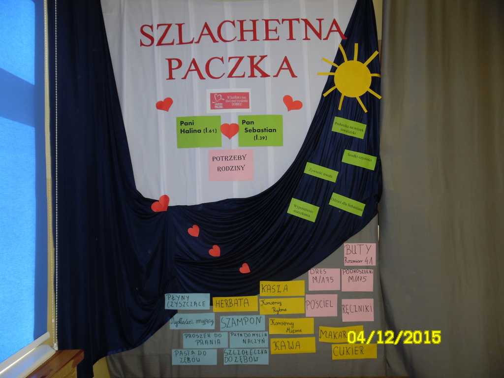 Przypominamy, że nasza społeczność szkolna poraz kolejny przystąpiła do ogólnopolskiej akcji SZLACHETNA PACZKA. Serdecznie zachęcamy do pomocy wybranej przez nas rodzinie. Potrzebne artykuły żywnościowe, chemiczne oraz pieniądze potrzebne na zakup poduszki pneumatycznej do wózka inwalidzkiego można przekazywać jeszcze do piątku, tj.11 grudnia.