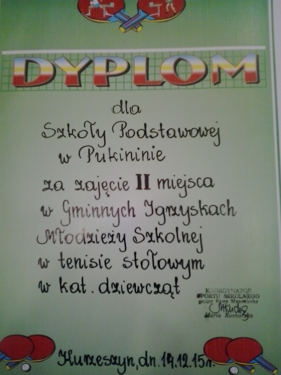 W dniu 14.12.2015r. uczniowie ze Szkoły Podstawowej w Pukininie brali udział w zawodach sportowych, w tenisie sportowym w Kurzeszynie. W zawodach uczestniczyli uczniowie z wszystkich szkół z gminy Rawa Mazowiecka. Naszą szkołę reprezentowali: Roksana Słomka, Ewelina Kurek, Klaudia Misztal, Krzysztof Kłos, Mateusz Nowak, Szymon Jaśkiewicz. Dziewczęta zajęły II miejsce, chłopcom poszło słabiej jednak obu drużynom Gratulujemy !