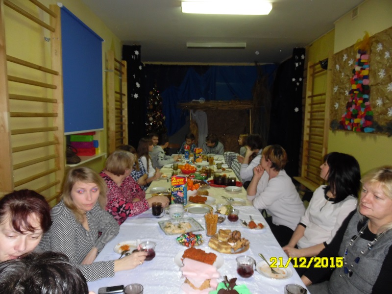 Rodzice i dzieci przygotowali stół nakryty białym obrusem, udekorowany świątecznym stroikiem. Na stole pojawiły tradycyjne wigilijne potrawy: czerwony barszcz z uszkami, pierogi z kapustą i grzybami, smażona ryba, ryba w sosie, śledzie w różnych odmianach, sałatki warzywne, ciasta, pierniczki przygotowane przez rodziców i dzieci. Spotkanie rozpoczęło się tradycyjnie od połamania się opłatkiem i złożenia życzeń świąteczno-noworocznych. Najbardziej oczekiwanym przez uczniów momentem tego wieczoru było wręczenie prezentów. Każdy otrzymał upominek, zaś rodzice dostali kartki z życzeniami, własnoręcznie wykonane przez swoje pociechy. Aby otrzymać prezent dzieci musiały zaśpiewać piosenkę lub powiedzieć wierszyk.