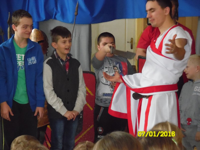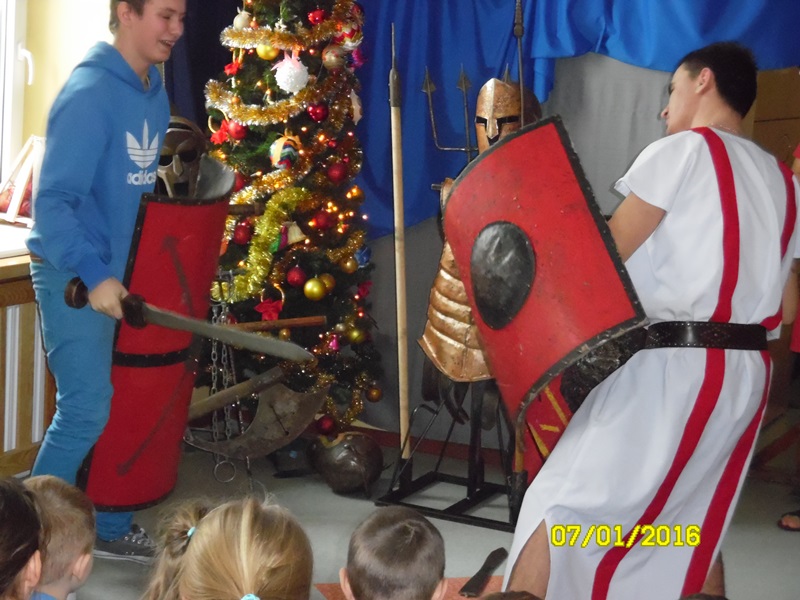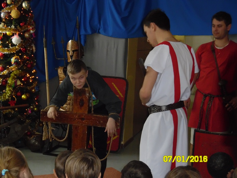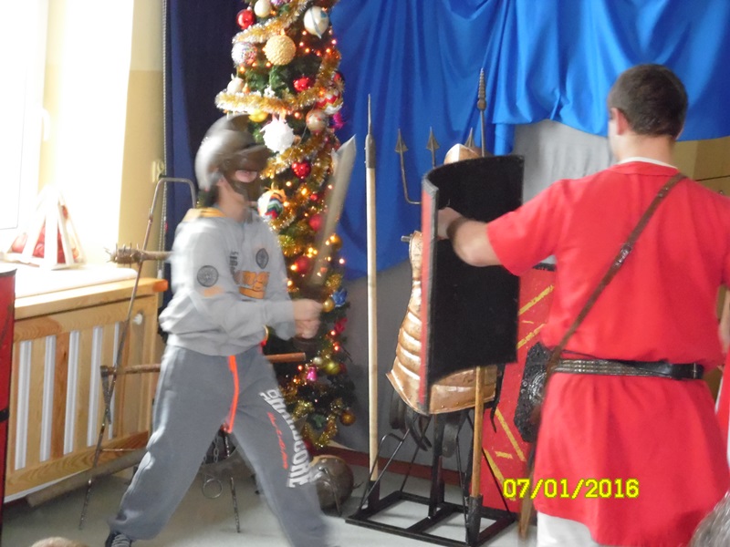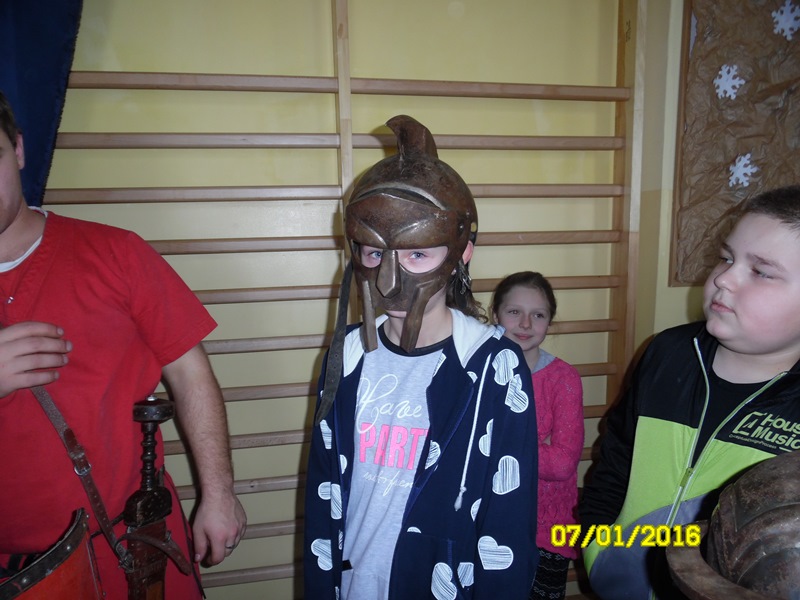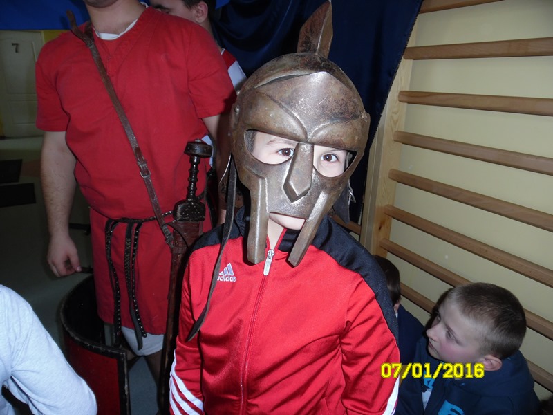 w zbrojach. Byli to członkowie grupy artystycznej „Rekonstrukto”. W ciekawy sposób przybliżyli okres Imperium Rzymskiego: wojsko, prawo, podział społeczny, wierzenia i wróżby, kulturę i łacinę. Panowie rekonstruktorzy pokazali ekwipunek i uzbrojenie legionisty rzymskiego z I w. n.e. Przeprowadzili wśród chętnych uczniów konkurs na legionistę, dając im do udźwignięcia rzymski miecz. Ci, którzy podołali zadaniu mogli potem zmierzyć się w pojedynku na broń białą. Dla niepokornych widzów były małe tortury, czyli przywiązanie do rzymskiego pręgierza. Po takiej prezentacji uczniowie mogli z bliska obejrzeć i przymierzyć przywiezione rekwizyty.