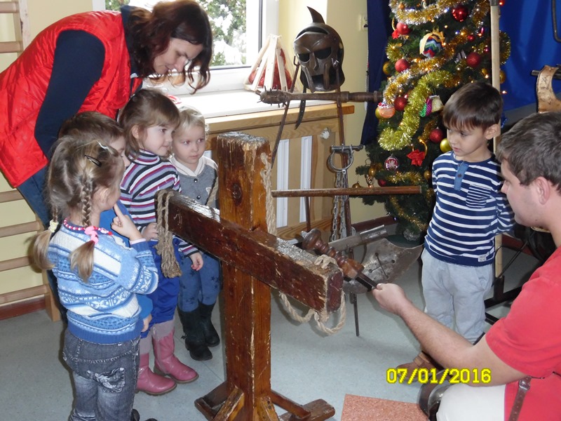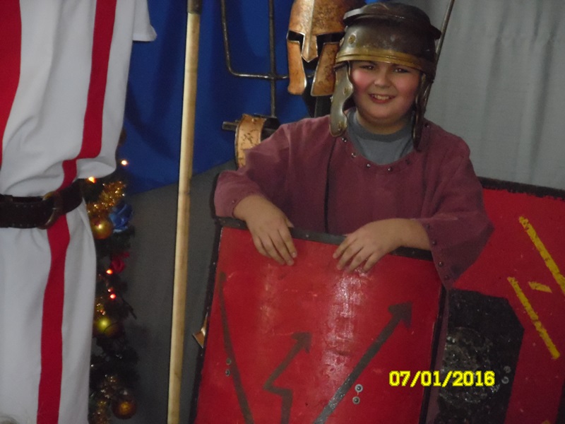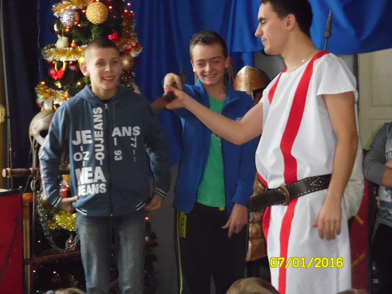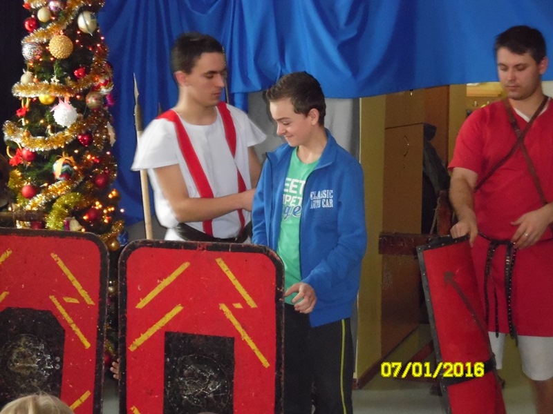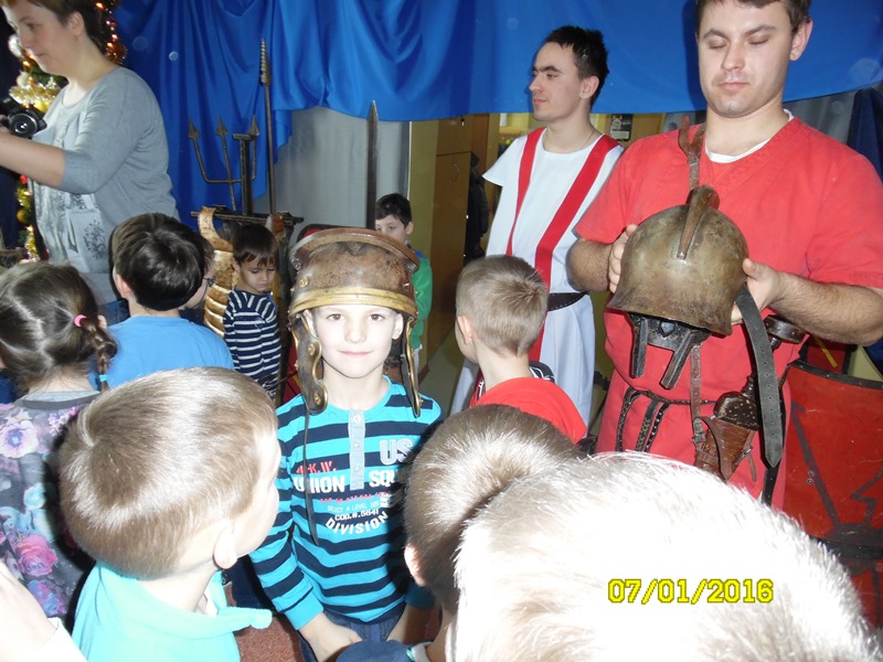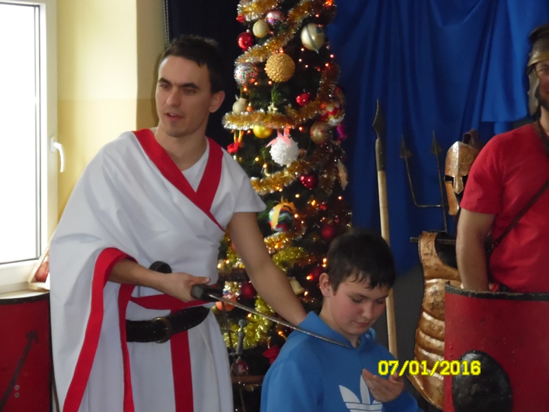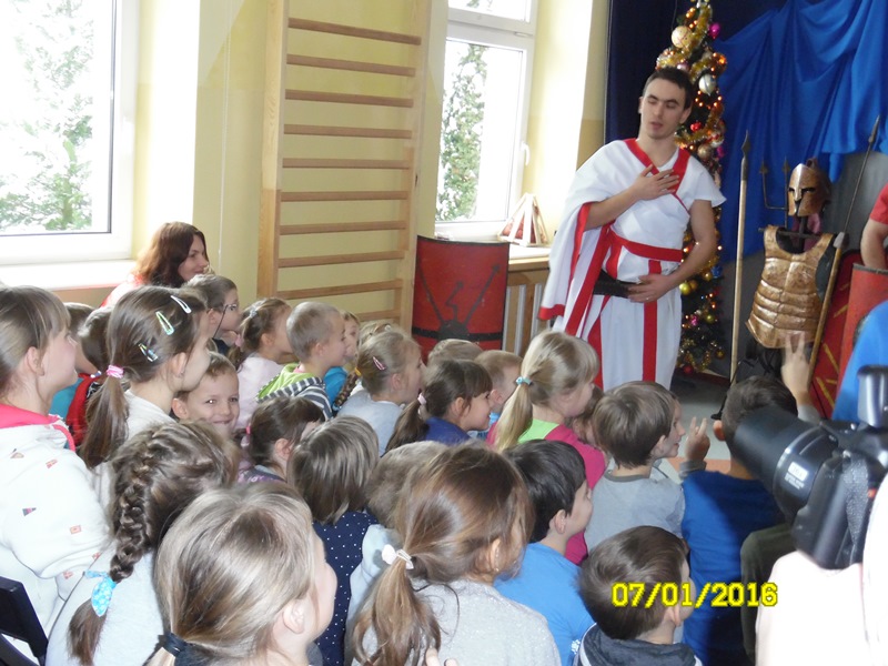 w zbrojach. Byli to członkowie grupy artystycznej „Rekonstrukto”. W ciekawy sposób przybliżyli okres Imperium Rzymskiego: wojsko, prawo, podział społeczny, wierzenia i wróżby, kulturę i łacinę. Panowie rekonstruktorzy pokazali ekwipunek i uzbrojenie legionisty rzymskiego z I w. n.e. Przeprowadzili wśród chętnych uczniów konkurs na legionistę, dając im do udźwignięcia rzymski miecz. Ci, którzy podołali zadaniu mogli potem zmierzyć się w pojedynku na broń białą. Dla niepokornych widzów były małe tortury, czyli przywiązanie do rzymskiego pręgierza. Po takiej prezentacji uczniowie mogli z bliska obejrzeć i przymierzyć przywiezione rekwizyty.
