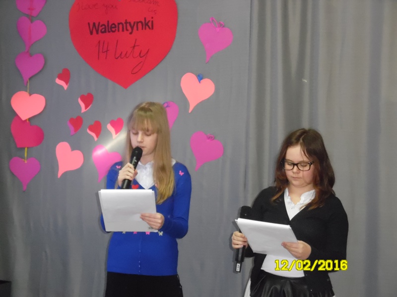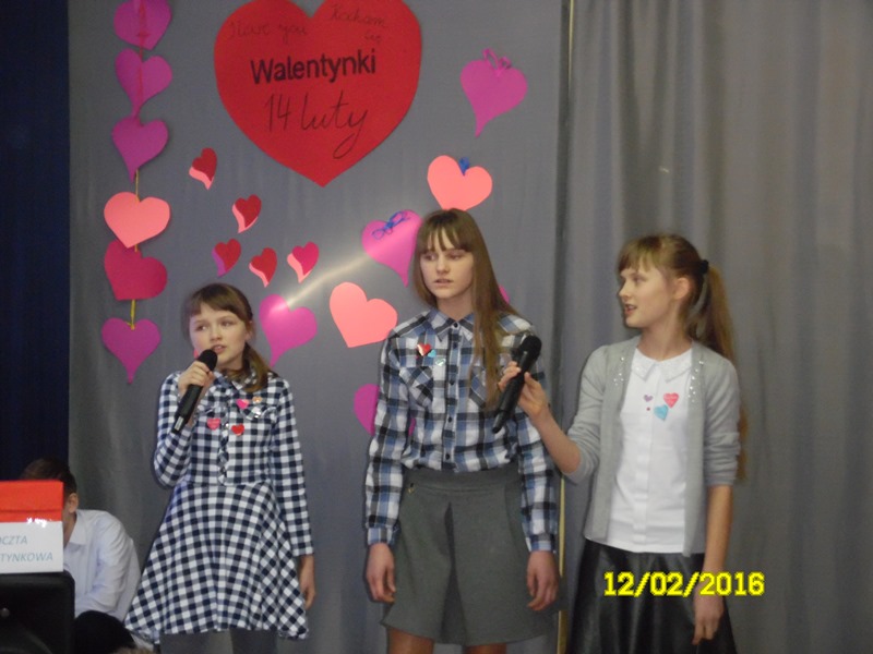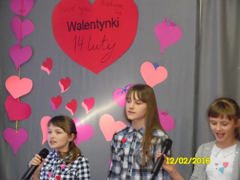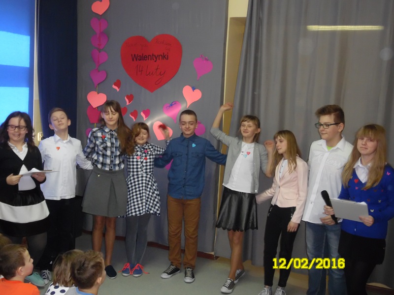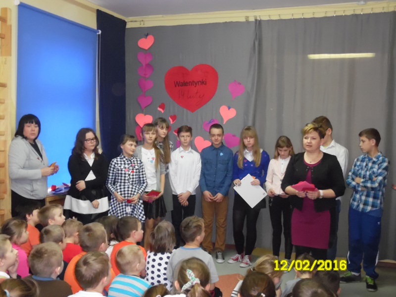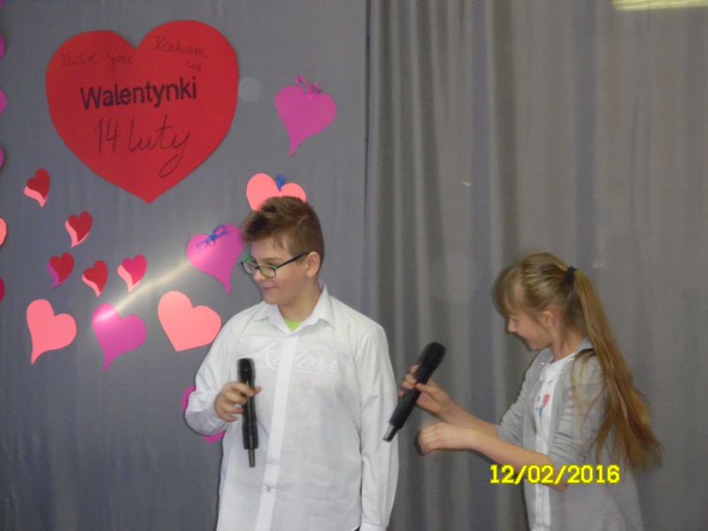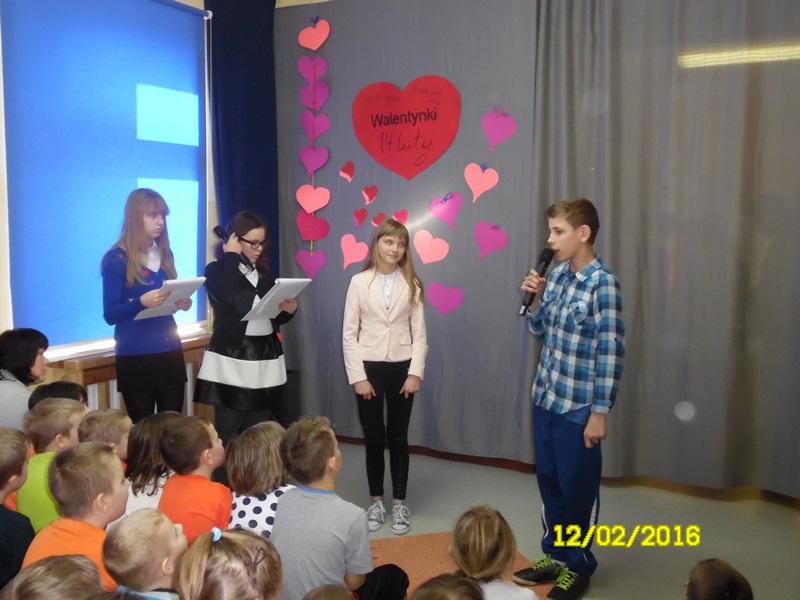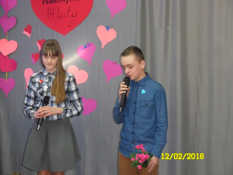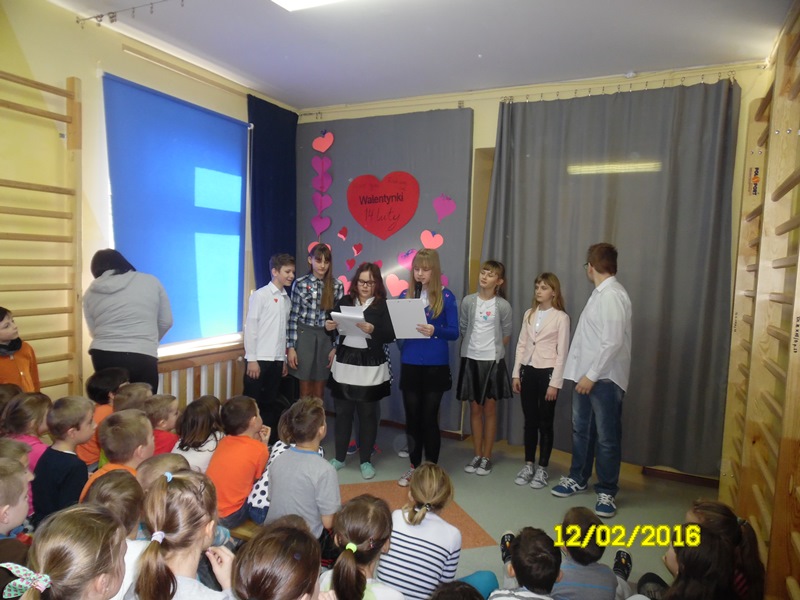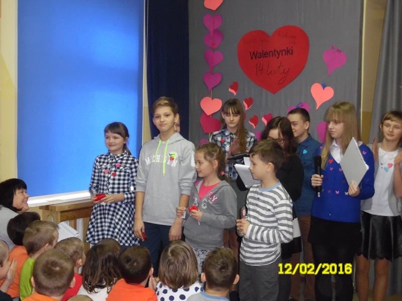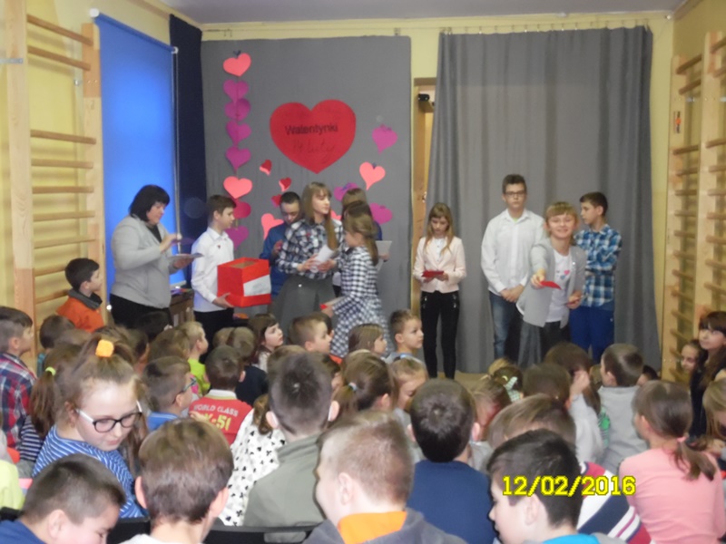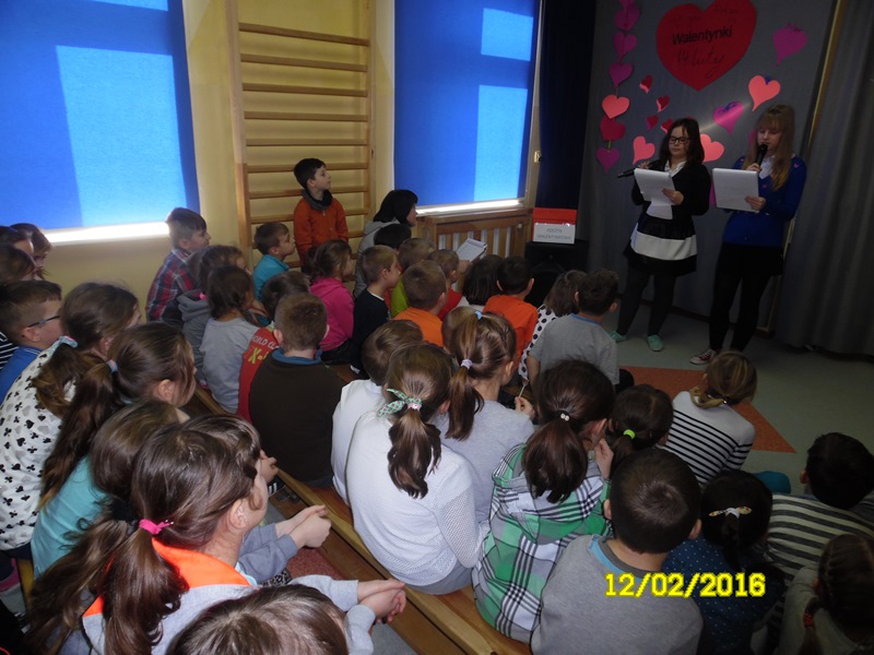 „Mamy dzisiaj WALENTYNKI święto chłopca i dziewczynki” tak rozpoczęła się impreza szkolna z okazji walentynek, którą przygotowali uczniowie Samorządu Uczniowskiego (odbyła się 12.02.2016r.) Uczniowie przygotowali wiersze i piosenki o miłości i przyjaźni. Następnie ogłoszone zostały wyniki plebiscytu na najsympatyczniejszą dziewczynę i najsympatyczniejszego chłopca w naszej szkole. Zostali nimi w kategorii klas I-III: Zosia Szewczyk i Kamil Redlicki a w kategorii klas IV-VI: Klaudia Misztal i Jakub Gąsiorowski. Zostały rozdane kartki walentynkowe, które znajdowały się w Poczcie Walentynkowej. Następnie opiekun SU podsumowała I semestr roku szkolnego 2015/2016:udział uczniów w konkursach, zawodach, akcjach charytatywnych. Na zakończenie imprezy Pani Dyrektor przypomniała uczniom o zachowaniu bezpieczeństwa w czasie nadchodzących ferii.