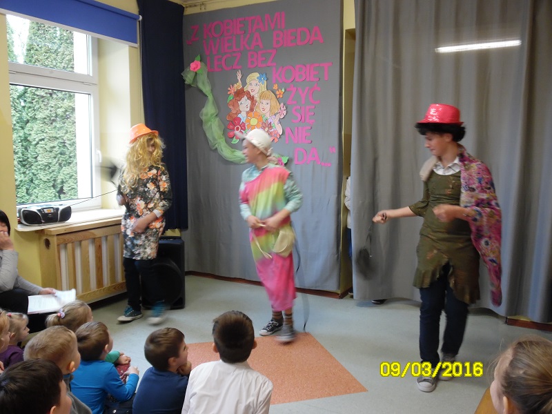 Od życzeń rozpoczęła się uroczystość z okazji Dnia Kobiet przygotowana przez chłopców z Samorządu Uczniowskiego. Przygotowali oni wiersze i piosenki (troczę żartobliwe, ale miłe) dotyczące kobiet, dziewcząt. Dużą odwagą wykazali się trzej chłopcy, którzy wykonali parodię do piosenki „Być kobietą”, byli przebrani za kobiety. Gratulujemy i w imieniu wszystkich kobiet – małych i dużych, dziękujemy.