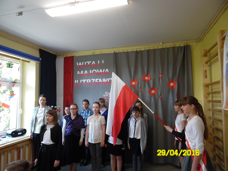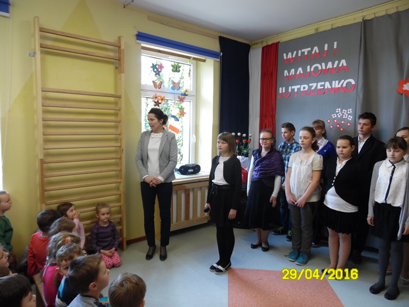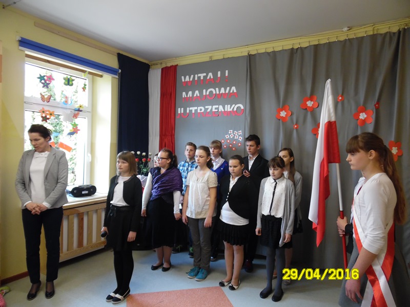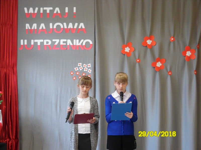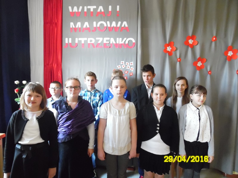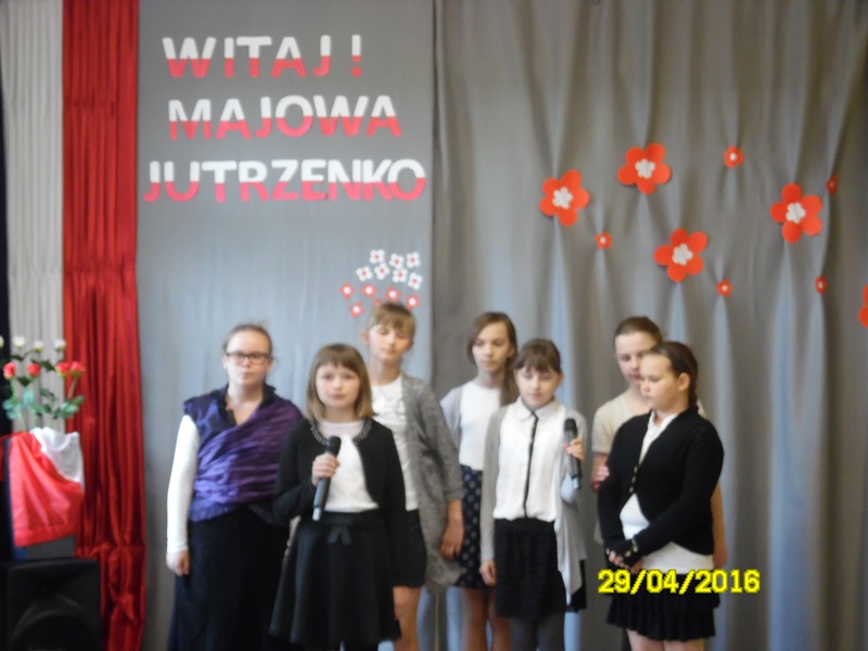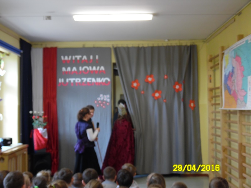 Po uroczystym odśpiewaniu hymnu uczniowie klasy VI zaprezentowali inscenizację dotyczącą okoliczności uchwalenia konstytucji 3 maja. Uczniowie i uczennice wcielili się między innymi w postaci: Polski, króla Stanisława Augusta Poniatowskiego, jego siostry Izabelli Branickiej oraz naszych zaborców - carycy Katarzyny II, króla pruskiego Fryderyka oraz cesarza austriackiego Franciszka. Inscenizacja została wzbogacona piosenkami wykonanymi przez szkolny chór. R.M.