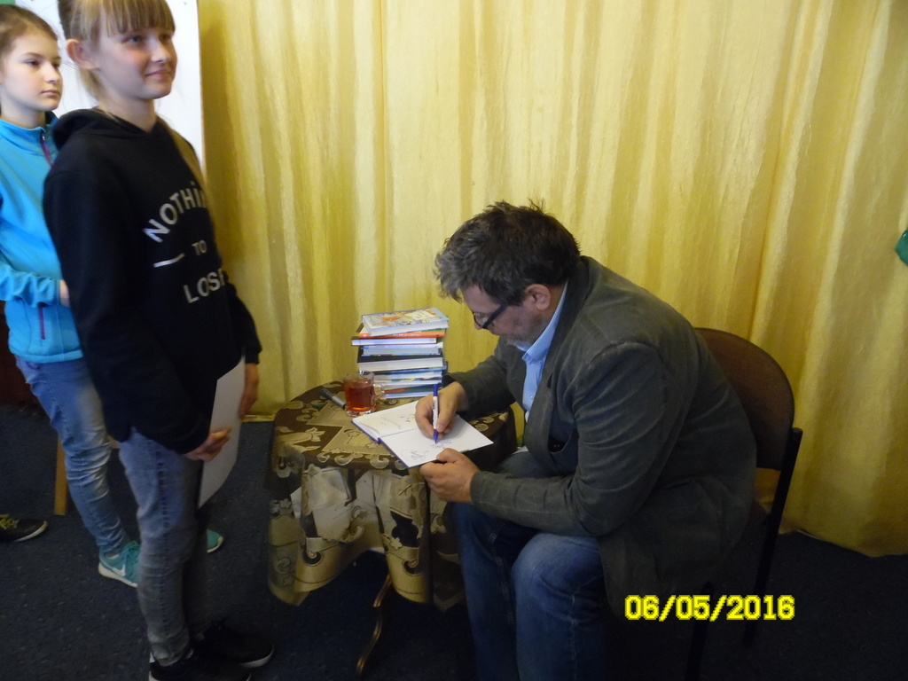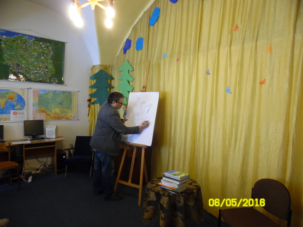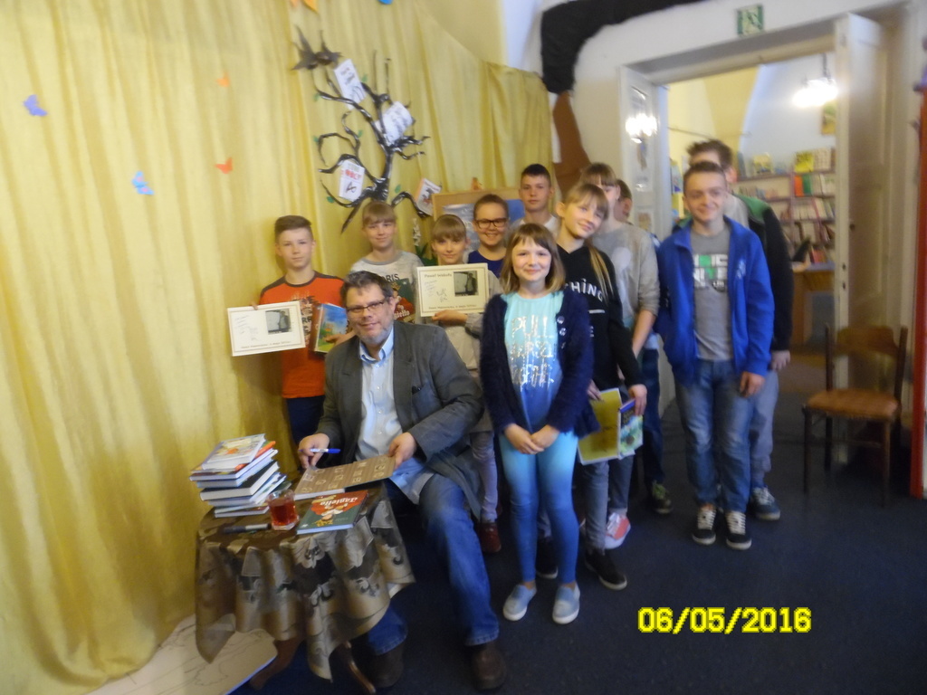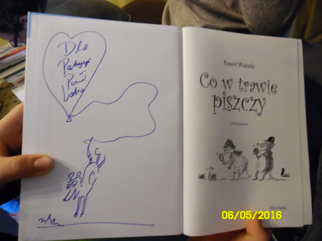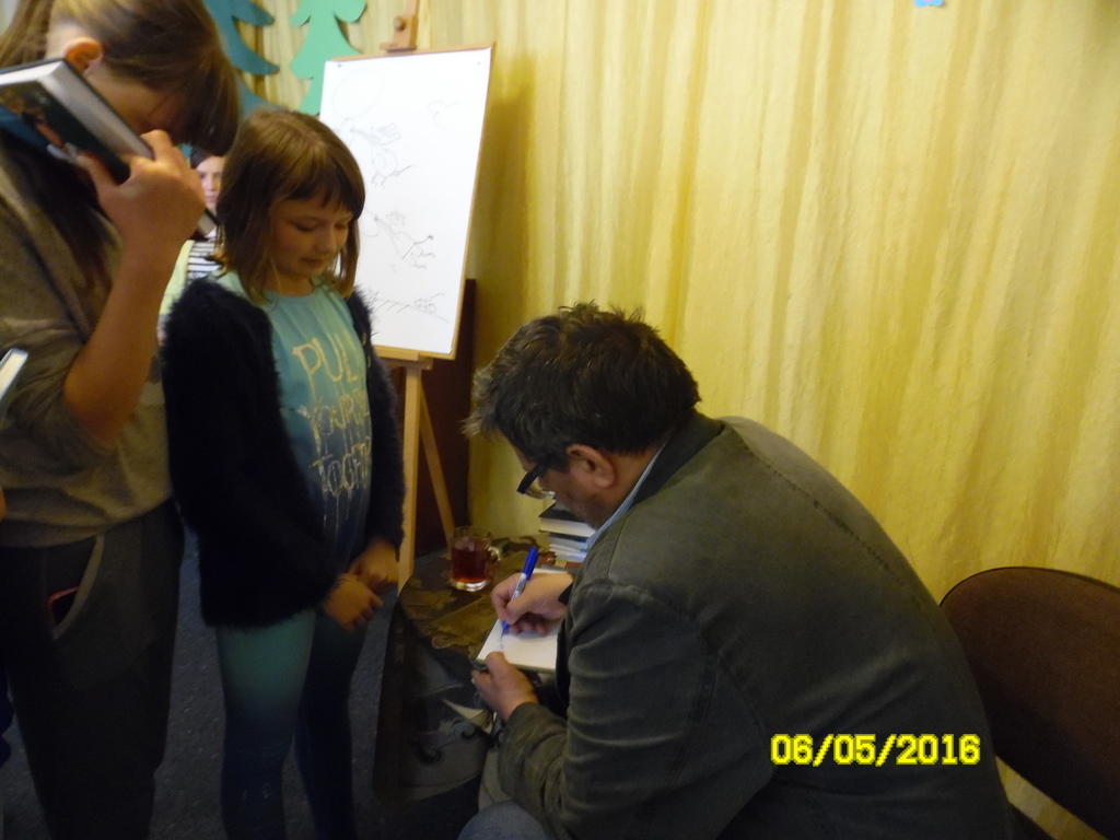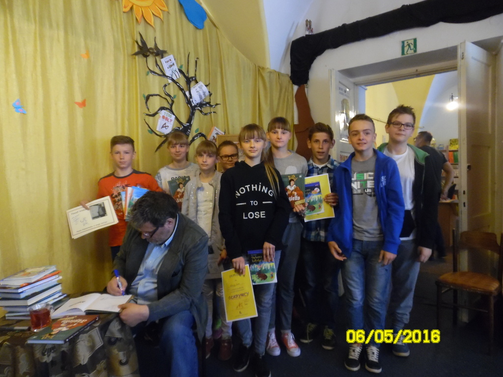 i rysowniczej, m.in. w "Angorce". Przedstawił swoje wybrane książki: "Jagiełło pod prysznicem", "Co w trawie piszczy?" oraz "Piastowskie orły" (we współpracy z dwoma innymi autorami). Dzięki opowiedzianym ciekawostkom, anegdotom oraz wykonanym "na żywo" rysunkom udało mu się przekonać uczestników spotkania, że książki, w tym książki historyczne, mogą być intersujące dla młodego czytelnika. Wybrał również zwycięską pracę plastyczną - rysunek do swojej książki "Jagiełło pod prysznicem". Rysunek ten wykonała Roksana Słomka i będzie on rywalizował dalej w konkursie, w którym główną nagrodą jest tablet. Na zakończenie spotkania autor wpisywał i rysował dedykacje w swoich książkach. R.M.
