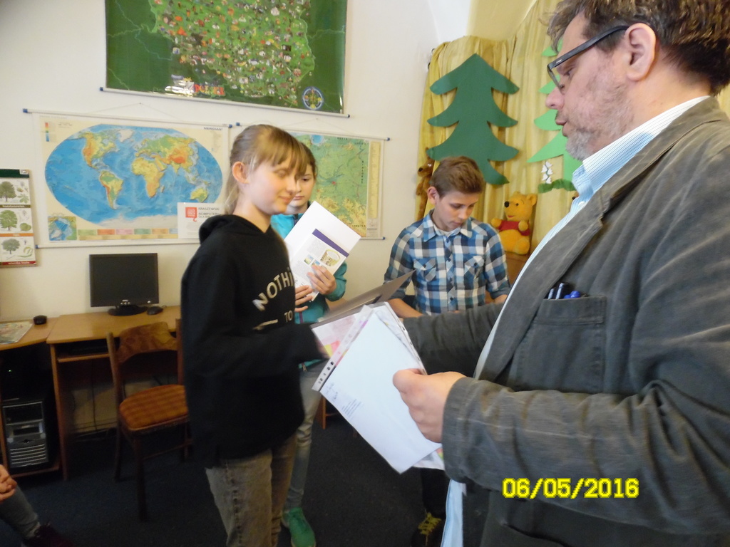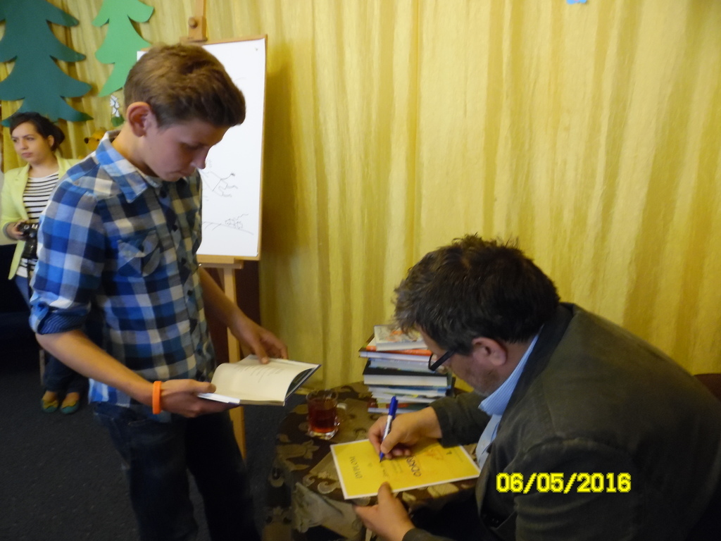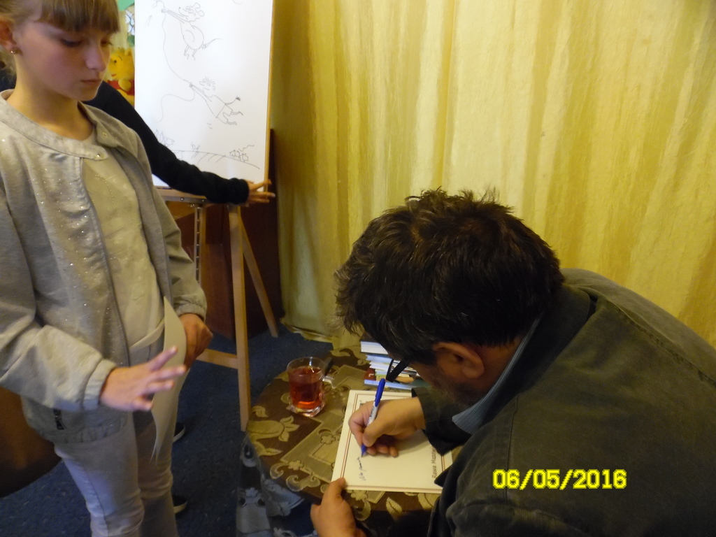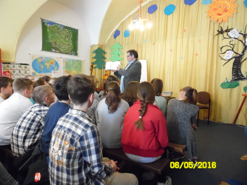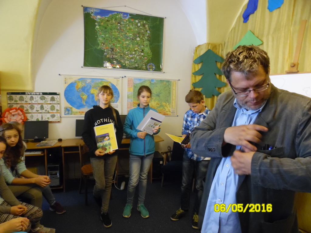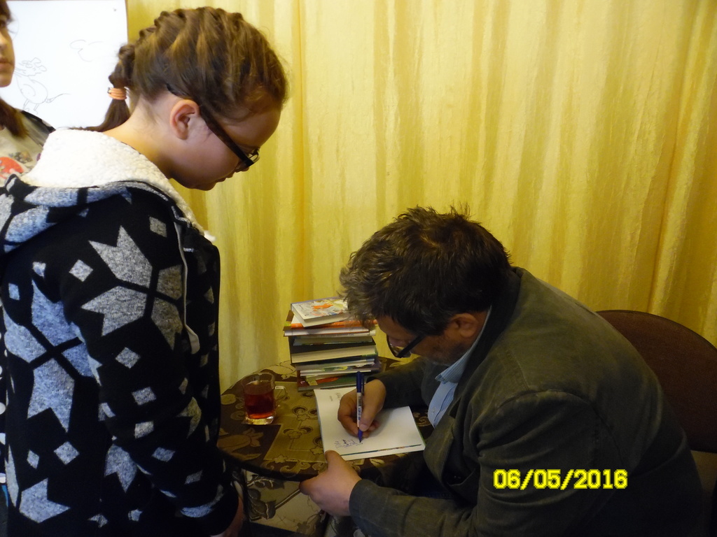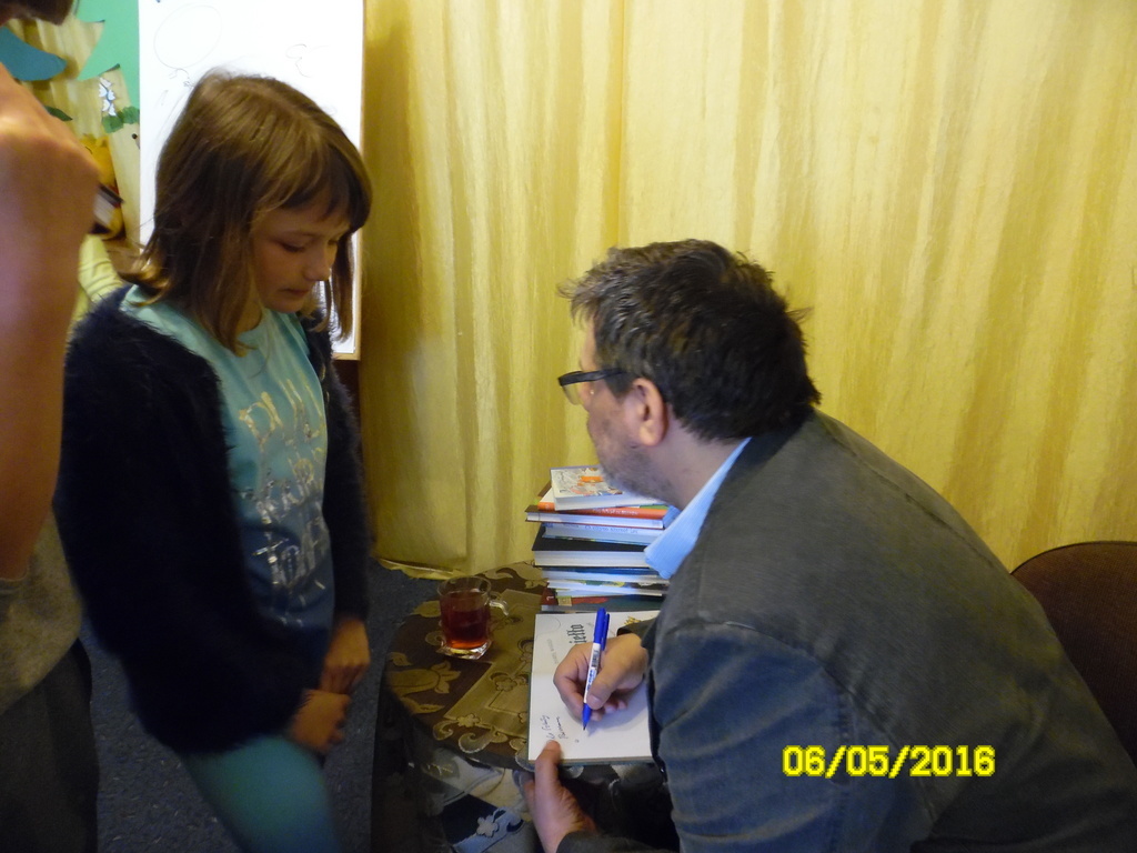 i rysowniczej, m.in. w "Angorce". Przedstawił swoje wybrane książki: "Jagiełło pod prysznicem", "Co w trawie piszczy?" oraz "Piastowskie orły" (we współpracy z dwoma innymi autorami). Dzięki opowiedzianym ciekawostkom, anegdotom oraz wykonanym "na żywo" rysunkom udało mu się przekonać uczestników spotkania, że książki, w tym książki historyczne, mogą być intersujące dla młodego czytelnika. Wybrał również zwycięską pracę plastyczną - rysunek do swojej książki "Jagiełło pod prysznicem". Rysunek ten wykonała Roksana Słomka i będzie on rywalizował dalej w konkursie, w którym główną nagrodą jest tablet. Na zakończenie spotkania autor wpisywał i rysował dedykacje w swoich książkach. R.M.