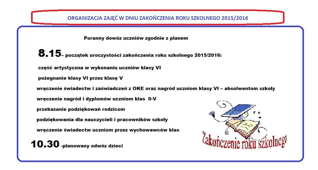 Zakończenie roku szkolnego - zaczynamy o godzinie 8.15!