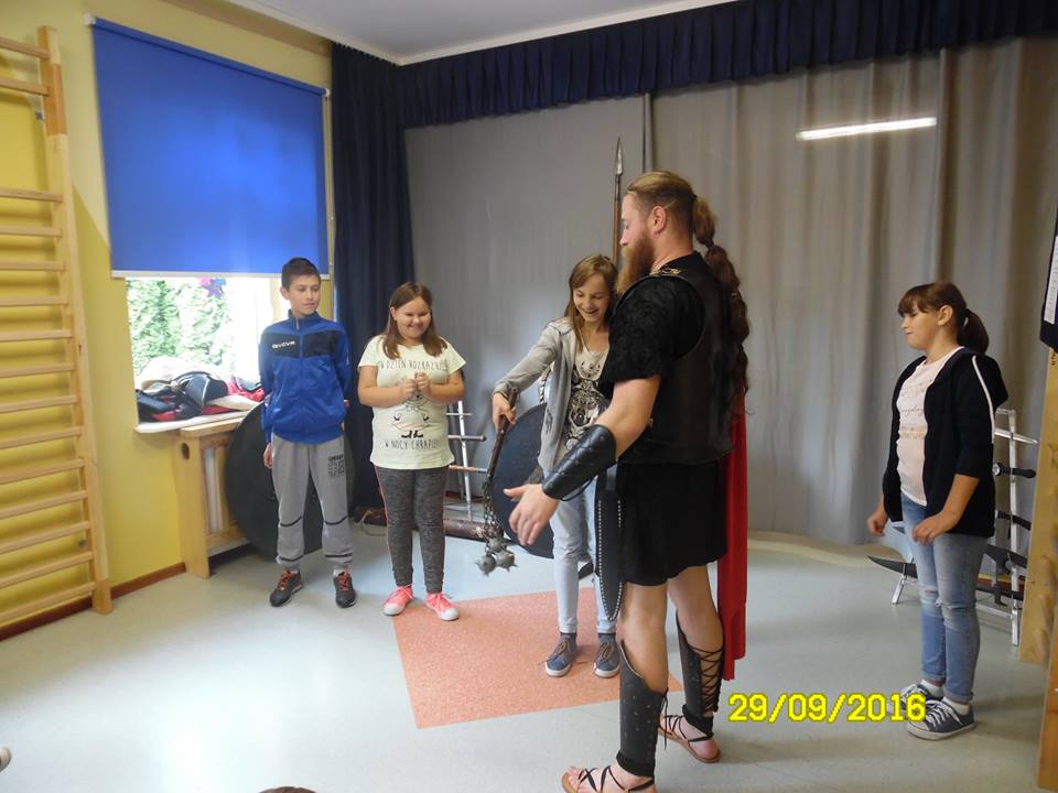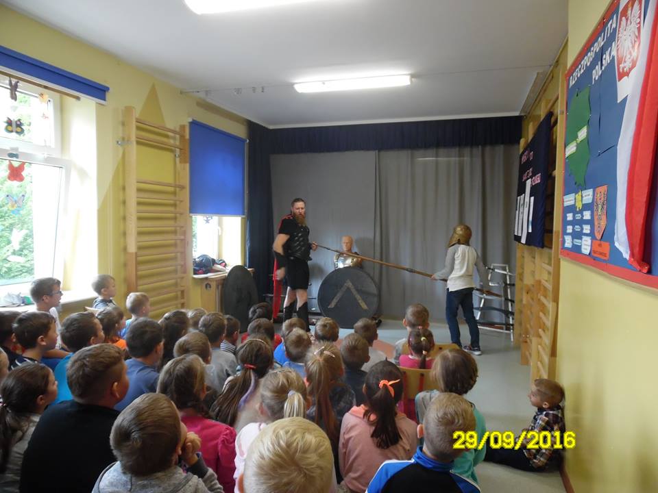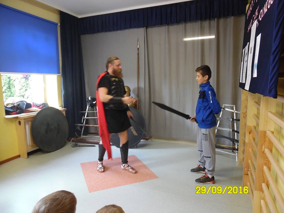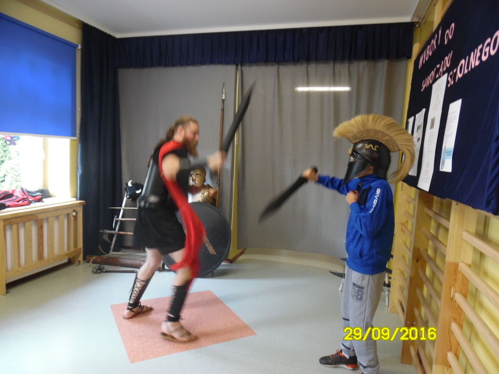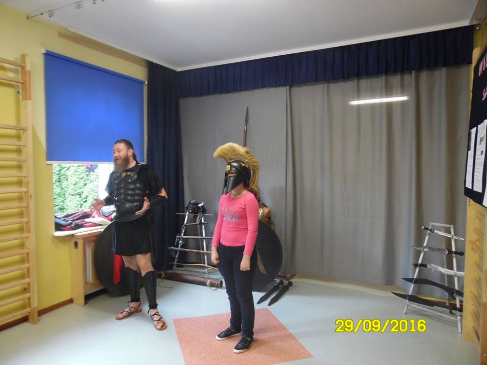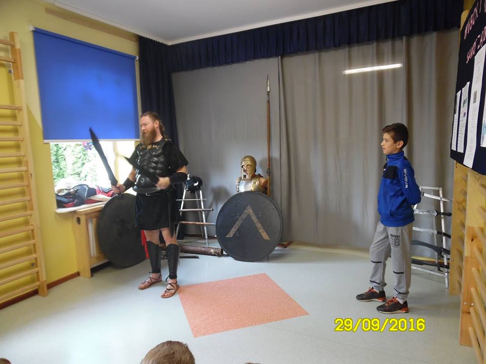 Niecodzienną lekcję historii mieli dzisiaj, tj. 29 września br., uczniowie w szkole. Na szkolnym korytarzu pojawił się... starożytny grecki wojownik - hoplita - w pełnym uzbrojeniu! Pan Szymon Harcej z grupy rekonstrukcyjnej "Hefaystos" przybliżył uczniom dzieje starożytnej Grecji, przede wszystkim uzbrojenia i sposobów prowadzenia walki przez starożytnych Hellenów. Chętni uczniowie mogli założyć hełm, wziąć do ręki tarczę, włócznię czy miecz. Odbył się również konkurs, polegający na wyłonieniu najsilniejszego ucznia, który stoczył pojedynek z prowadzącym pokaz. Taka "żywa" lekcja historii bardzo się dzieciom spodobała i nagrodziły pokaz gromkimi brawami. R. Maciejewska
