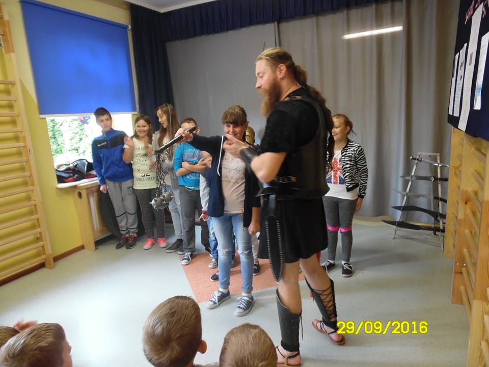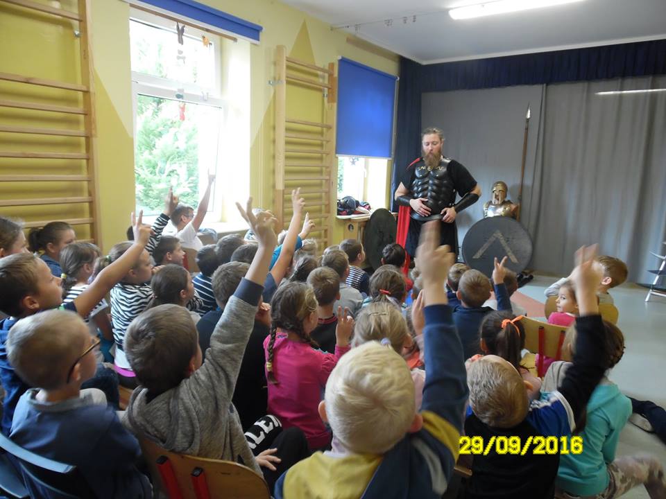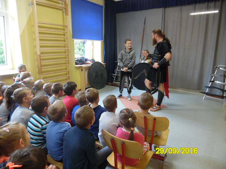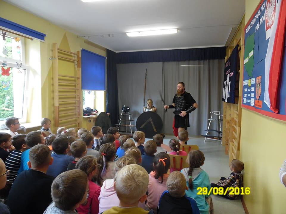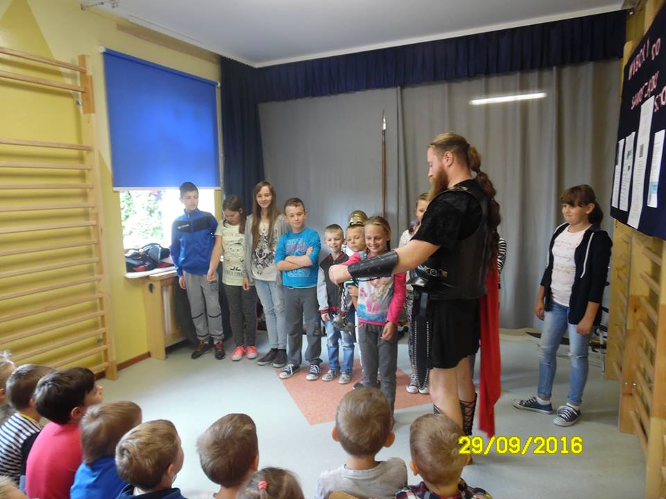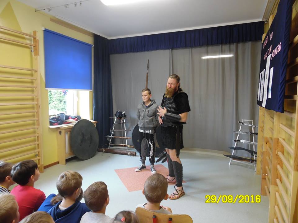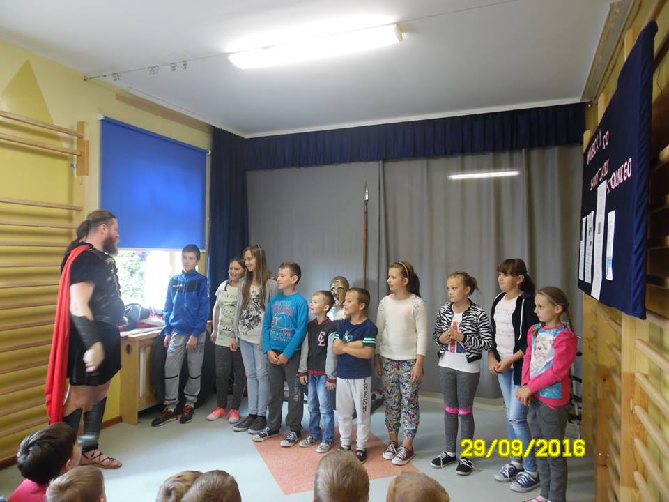 Niecodzienną lekcję historii mieli dzisiaj, tj. 29 września br., uczniowie w szkole. Na szkolnym korytarzu pojawił się... starożytny grecki wojownik - hoplita - w pełnym uzbrojeniu! Pan Szymon Harcej z grupy rekonstrukcyjnej "Hefaystos" przybliżył uczniom dzieje starożytnej Grecji, przede wszystkim uzbrojenia i sposobów prowadzenia walki przez starożytnych Hellenów. Chętni uczniowie mogli założyć hełm, wziąć do ręki tarczę, włócznię czy miecz. Odbył się również konkurs, polegający na wyłonieniu najsilniejszego ucznia, który stoczył pojedynek z prowadzącym pokaz. Taka "żywa" lekcja historii bardzo się dzieciom spodobała i nagrodziły pokaz gromkimi brawami. R. Maciejewska