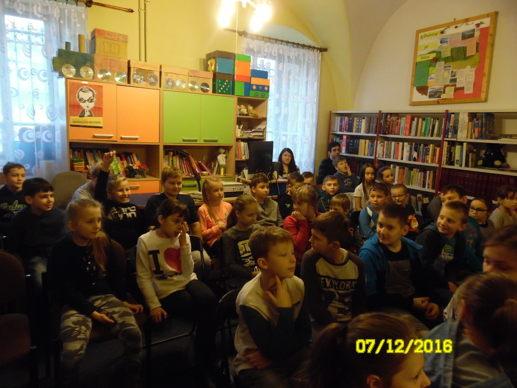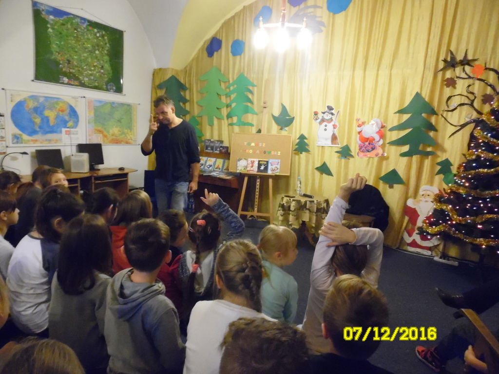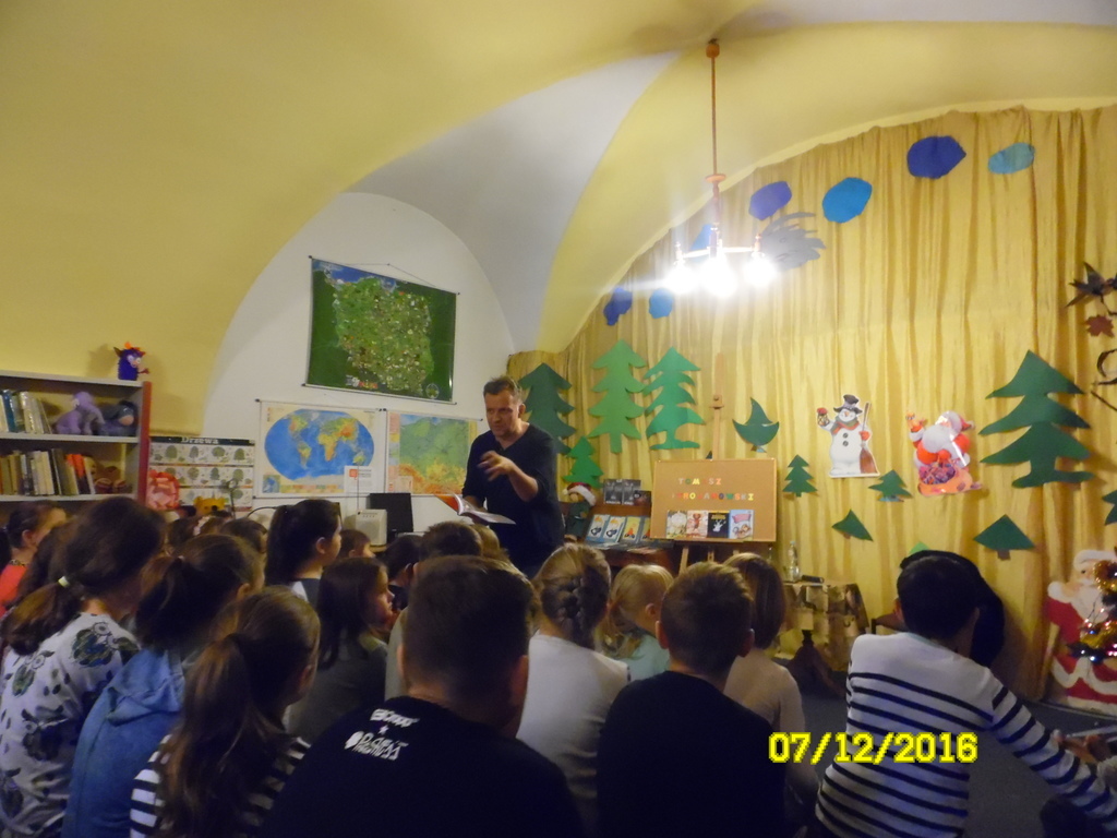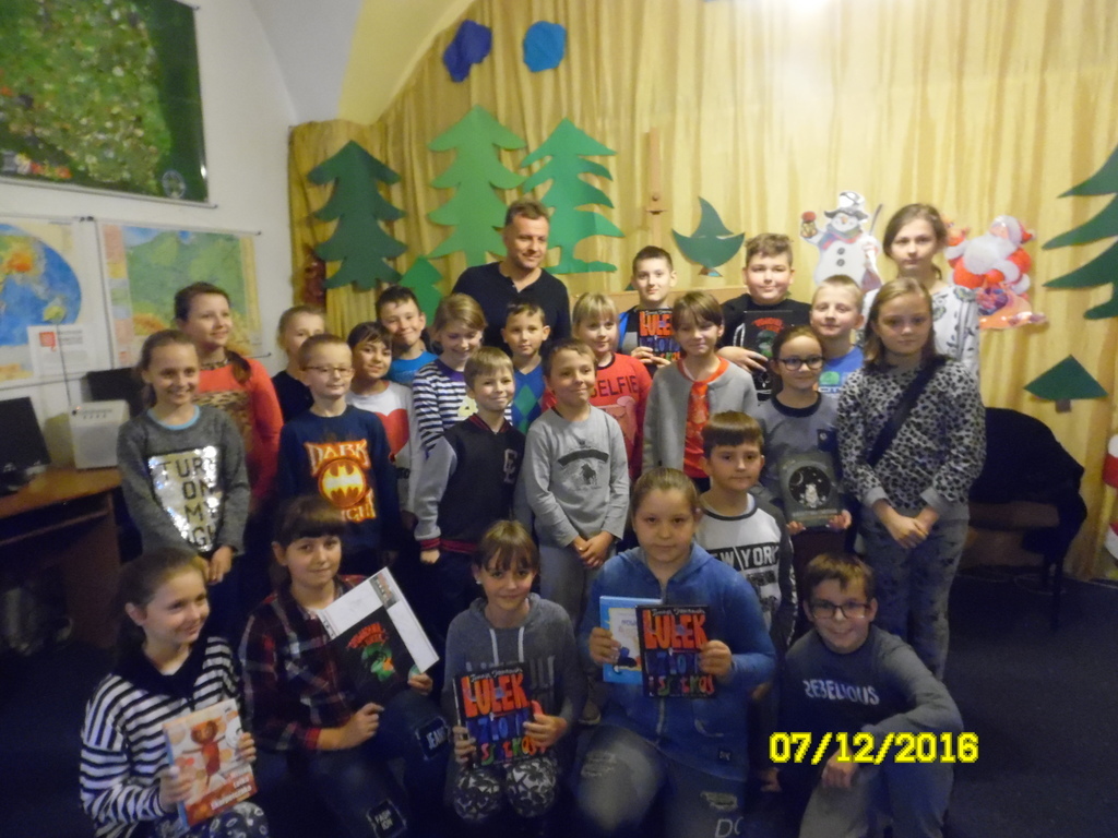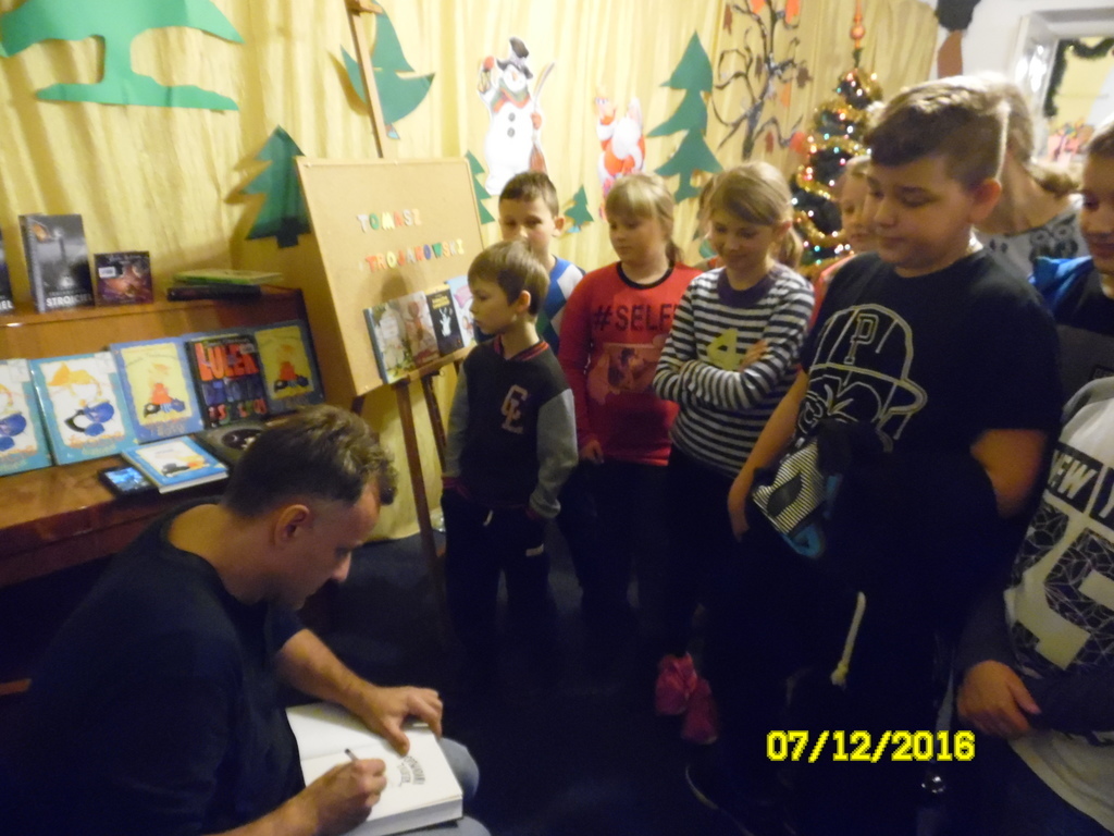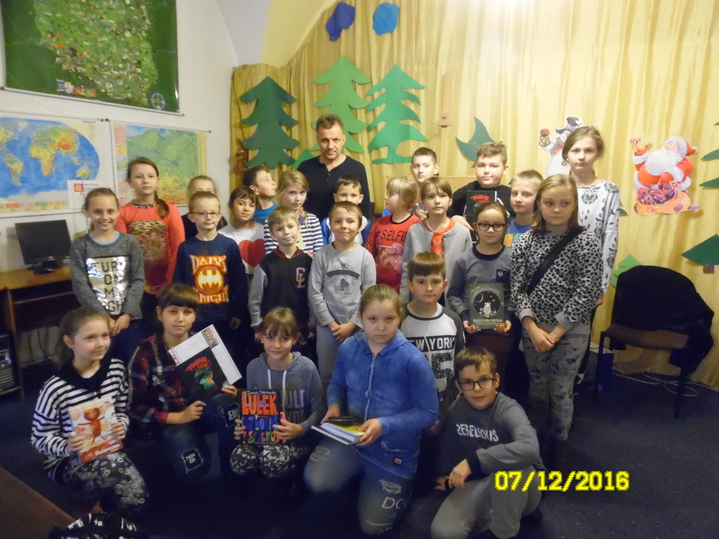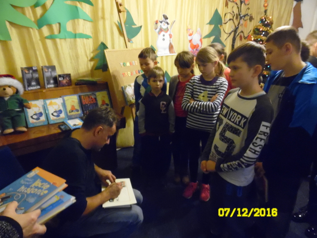 W środę 7 grudnia br. uczniowie klas III i IV wzięli udział w spotkaniu autorskim zorganizowanym przez Bibliotekę Publiczną Oddział dla Dzieci w Rawie Mazowieckiej. Gościem spotkania był pisarz i autor słuchowisk Tomasz Trojanowski. Opowiedział dzieciom o czasach, kiedy nie było: komputerów, tabletów, telefonów komórkowych, czyli czasach swojego dzieciństwa. Zdradził im, że dla niego wtedy oknem na świat stały się książki. Przekazał im również, że czytanie to magia tworzona przez pisarza i czytelnika oraz, że czytanie to przeżywanie czytanej historii tak, aby coś z niej w nas zostało. Następnie były zadawane pytania. Uczestników spotkania ciekawiło: ile książek napisał, kiedy postanowił zostać pisarzem, jaką ma ulubioną książkę, kim chciał być w dzieciństwie. Na zakończenie można było otrzymać autograf pisarza z dedykacją w jego książkach. RM