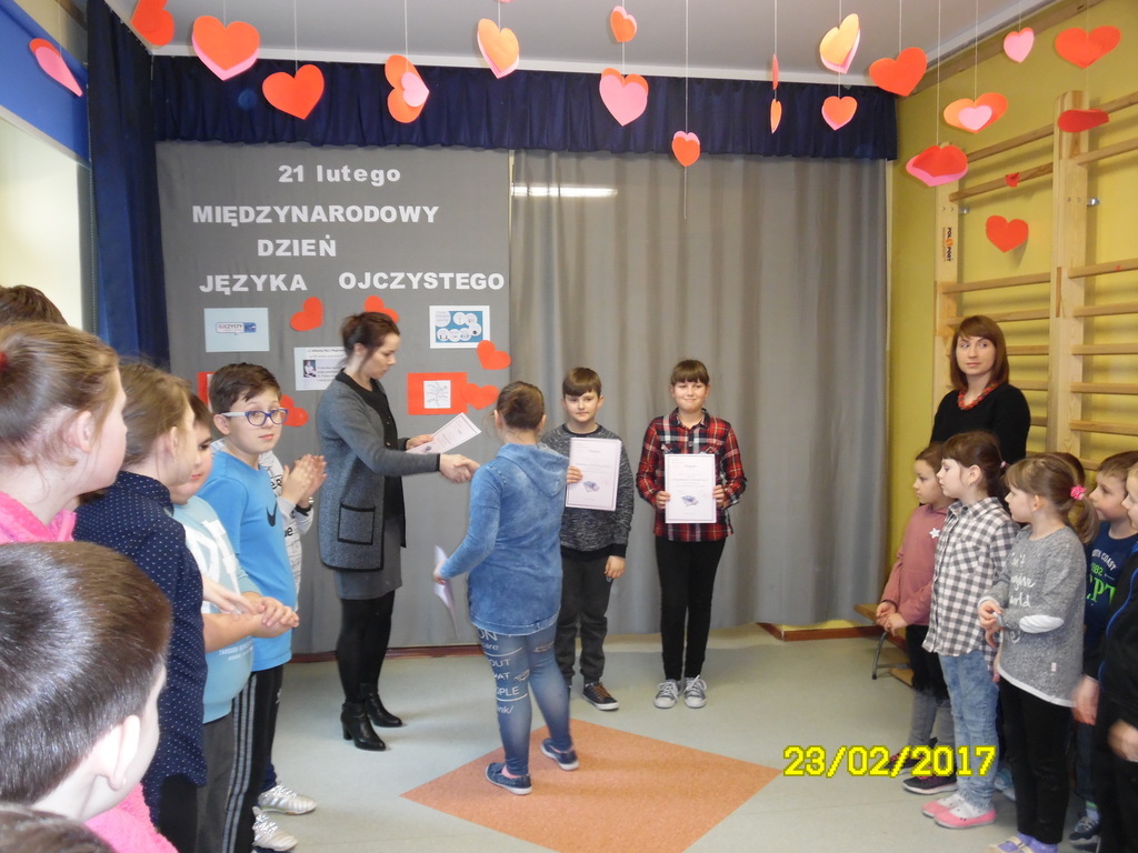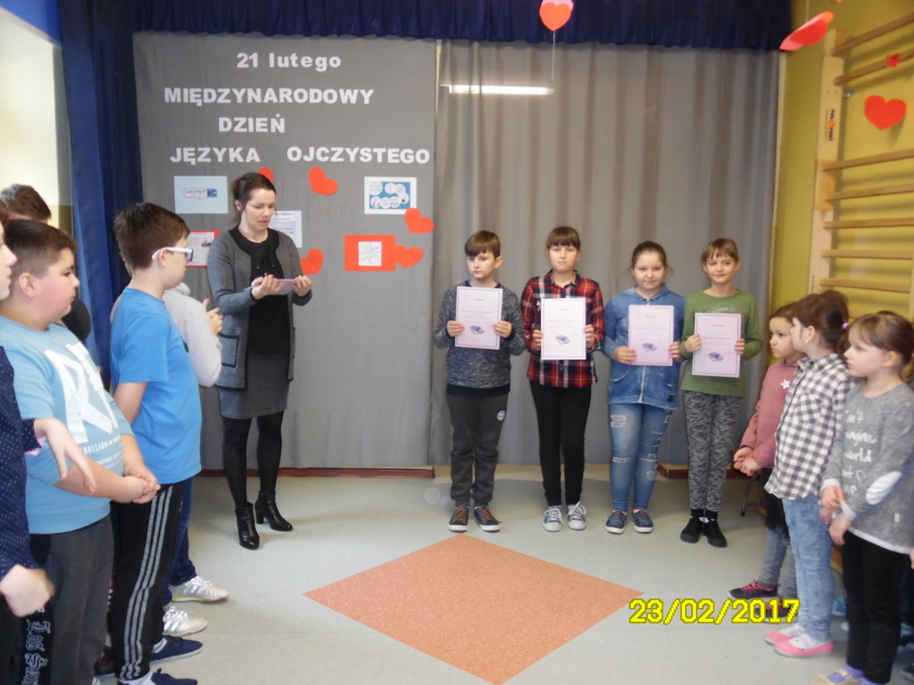 W naszej szkole w ramach obchodów tego święta uczniowie klas IV-VI wzięli udział w quizie o tytuł Mistrza Języka Polskiego w poszczególnych klasach. Młodsi uczniowie ćwiczyli dykcję próbując wymawiać "łamańce językowe" typu: stół z powyłamywanymi nogami,