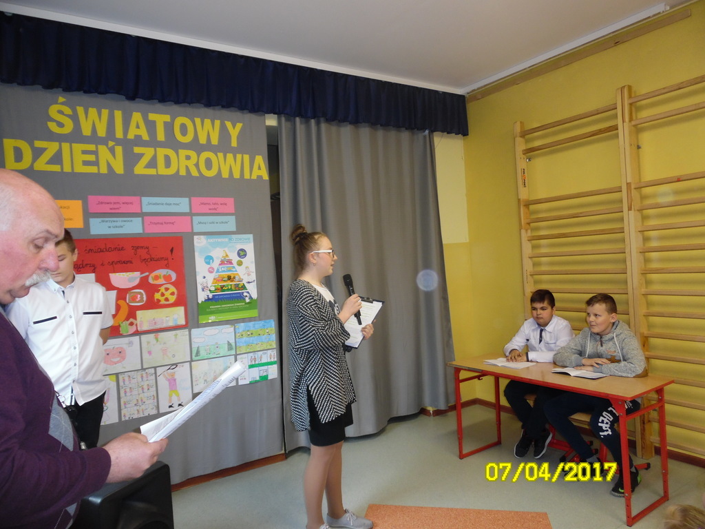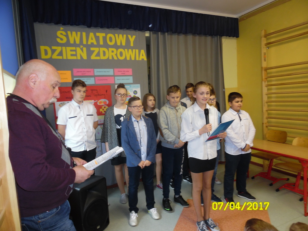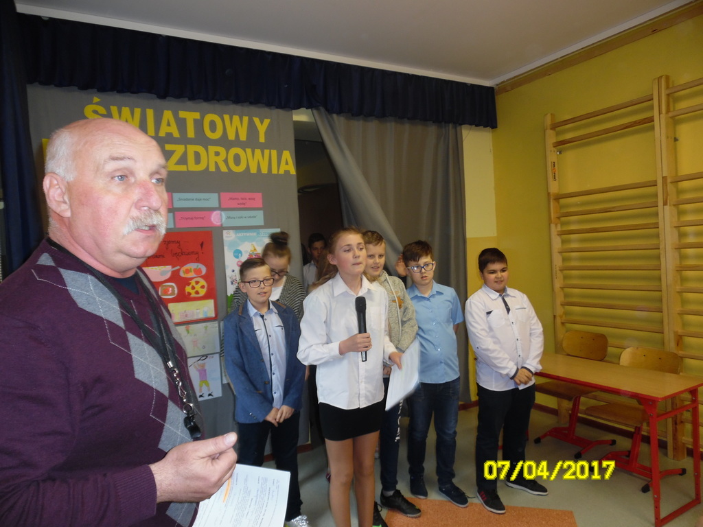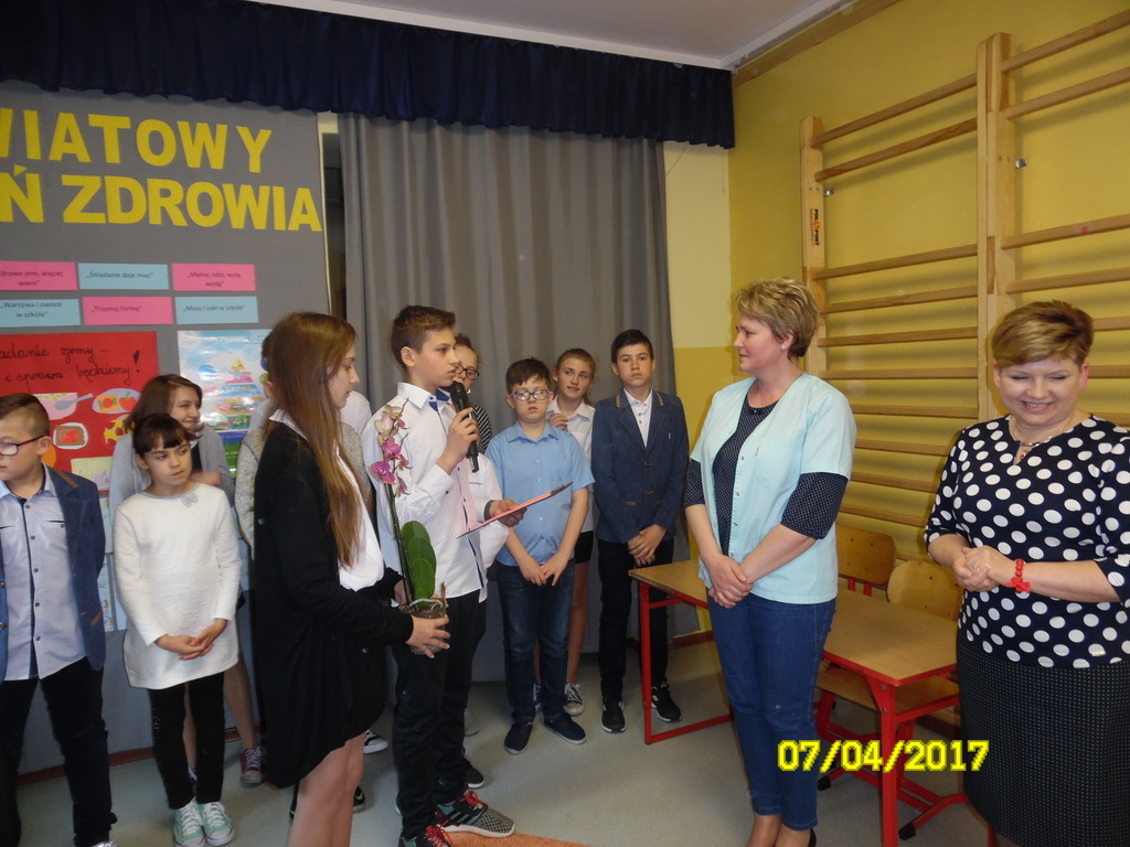 7 kwietnia br. w naszej szkole z okazji Światowego Dnia Zdrowia oraz Dnia Służby Zdrowia odbyły się połączone obchody tych dwóch świąt. Ucznowie klas: II, III i VI pod opieką pana Zbigniewa Stępniaka zaprezentowali przedstawienie o tematyce prozdrowotnej. Nie zabrakło wskazówek dotyczących: higieny ciała i umysłu, zdrowego odżywiania, sportu i wypoczynku. Były nawet wiersze Kochanowskiego i Krasickiego o zdrowiu. Występ został wzbogacony o piosenki w wykonaniu uczniów klas II i III oraz odpowiednią tematyczną gazetkę. Gościem specjalnym tej uroczystości była pani pielęgniarka Anna Kaźmierczak z przychodni "Raw-medica", której uczniowie złożyli życzenia oraz podziękowania za dotychczasową opiekę pielęgniarską. RM.