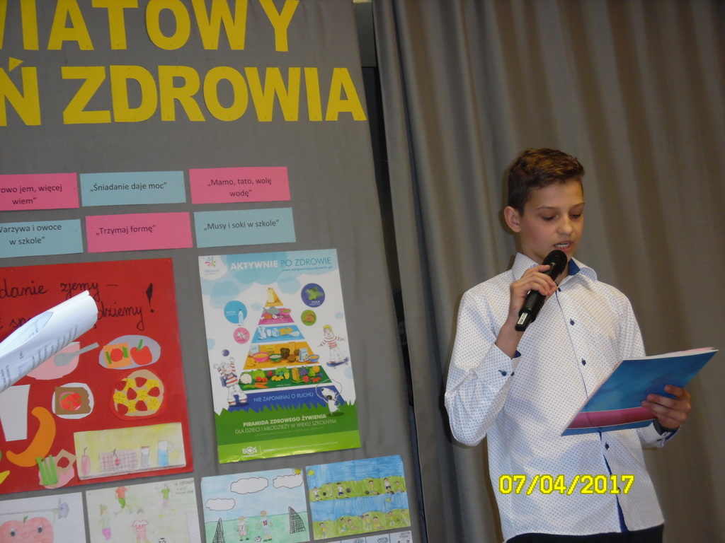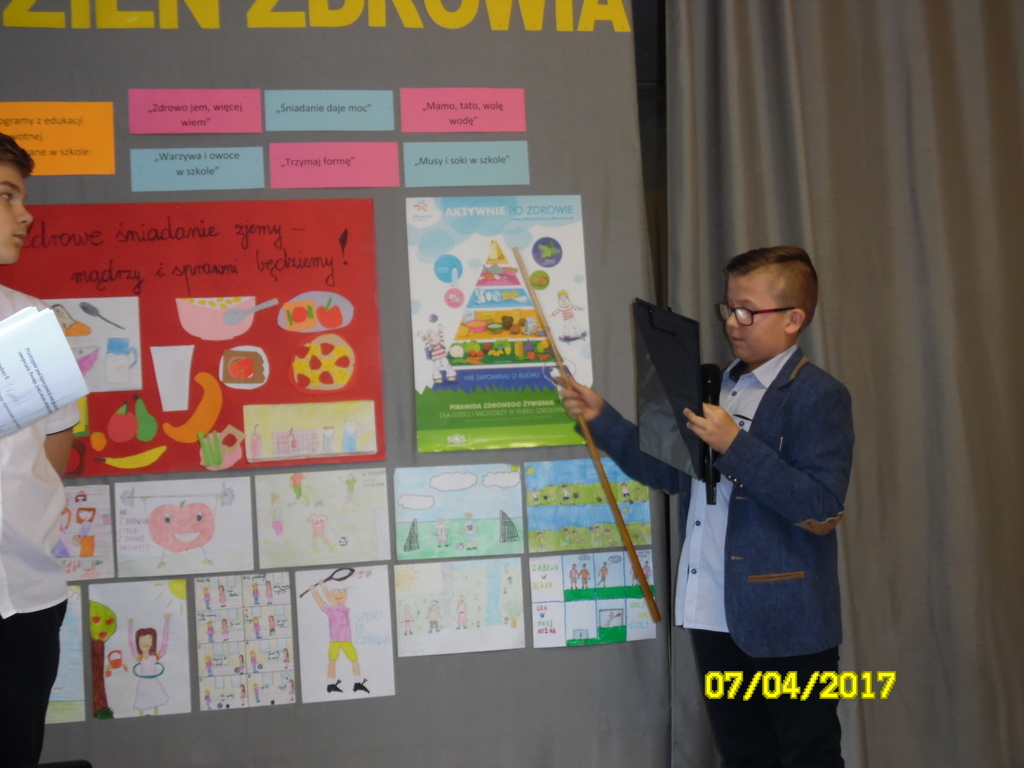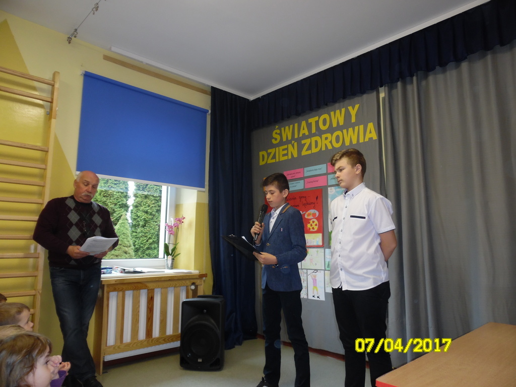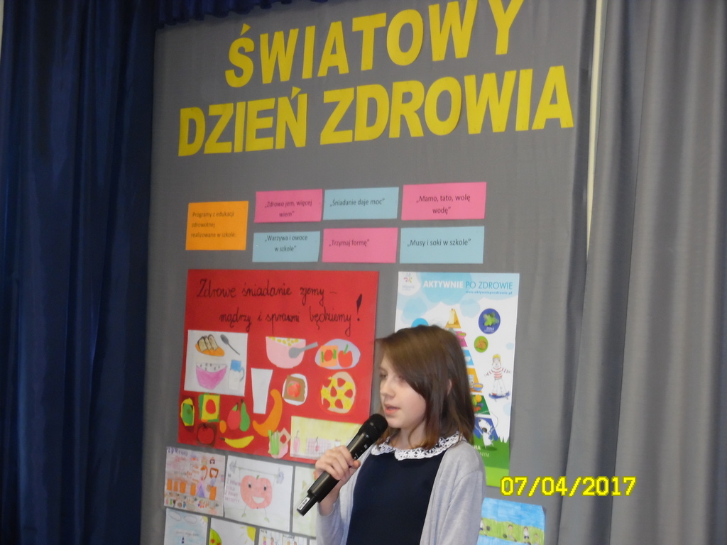 7 kwietnia br. w naszej szkole z okazji Światowego Dnia Zdrowia oraz Dnia Służby Zdrowia odbyły się połączone obchody tych dwóch świąt. Ucznowie klas: II, III i VI pod opieką pana Zbigniewa Stępniaka zaprezentowali przedstawienie o tematyce prozdrowotnej. Nie zabrakło wskazówek dotyczących: higieny ciała i umysłu, zdrowego odżywiania, sportu i wypoczynku. Były nawet wiersze Kochanowskiego i Krasickiego o zdrowiu. Występ został wzbogacony o piosenki w wykonaniu uczniów klas II i III oraz odpowiednią tematyczną gazetkę. Gościem specjalnym tej uroczystości była pani pielęgniarka Anna Kaźmierczak z przychodni "Raw-medica", której uczniowie złożyli życzenia oraz podziękowania za dotychczasową opiekę pielęgniarską. RM.