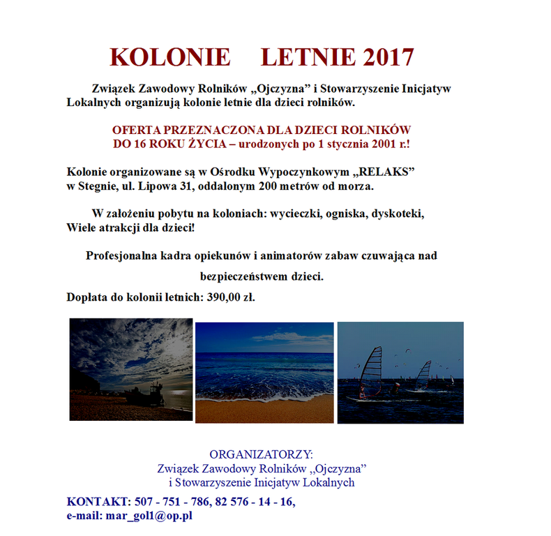Związek Zawodowy Rolników „Ojczyzna” i Stowarzyszenie Inicjatyw Lokalnych organizują kolonie letnie dla dzieci rolników.