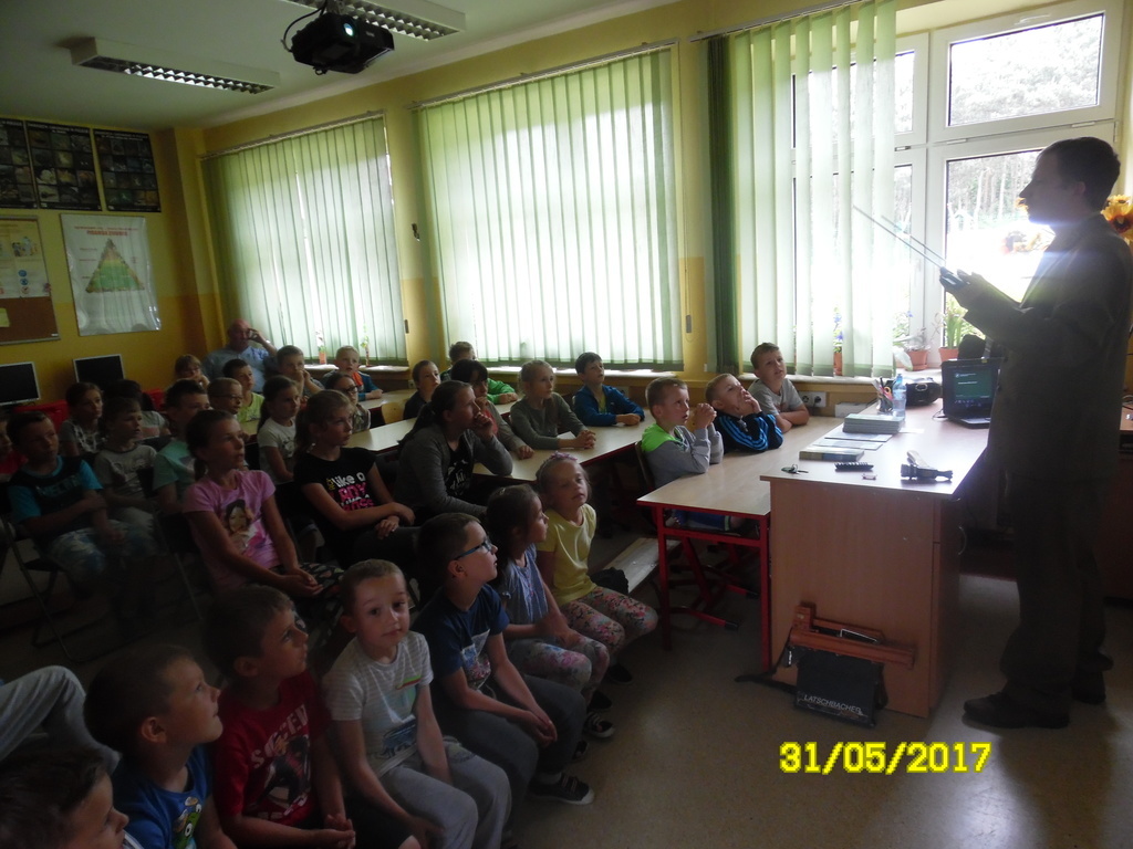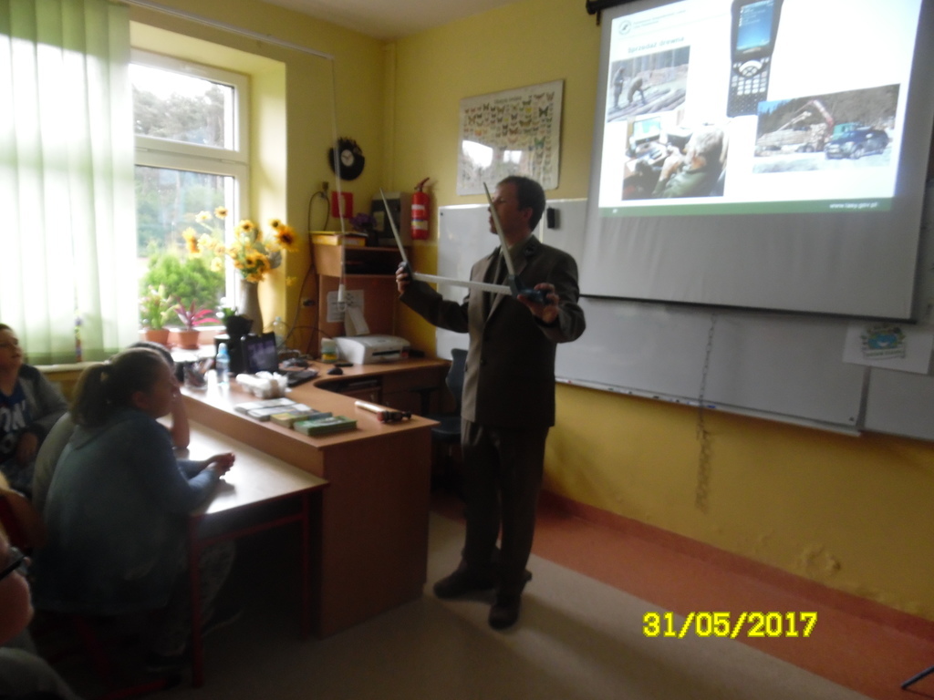 Dzisiaj, czyli ostatniego dnia maja br. naszą szkołę odwiedził niecodzienny gość. Z wizytą przybył do nas człowiek, dla którego codziennym środowiskiem pracy jest las. Leśniczy Przemysław Boguszewski z leśnictwa Julianów opowiedział uczniom klas IV-VI oraz dzieciom z klas