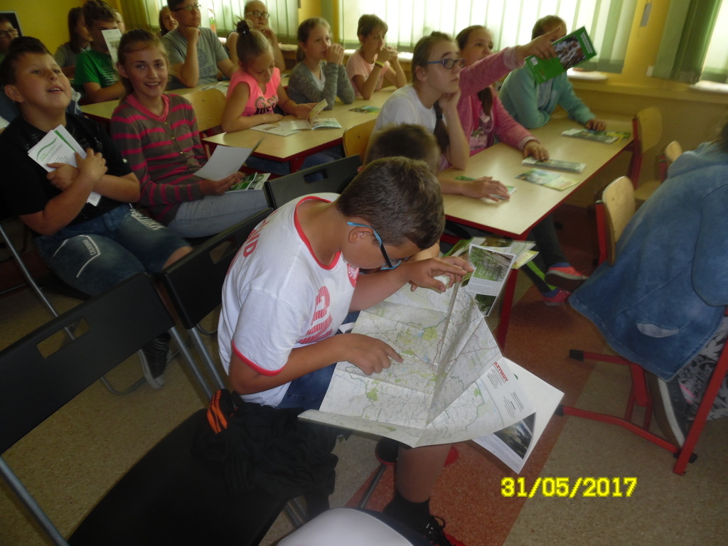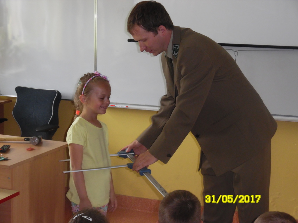0-III o pracy leśnika, o zagrożeniach dla lasu oraz o potrzebie ochrony lasów. Starszym uczniom pan leśniczy pokazał narzędzia pracy leśników - przyrządy do pomiaru grubości pnia drzewa oraz do nabijania numerów na ściętych drzewach. Na zakończenie pogadanki uczniowie otrzymali ulotki i mapki dotyczące nadleśnictwa Skierniewice. RM