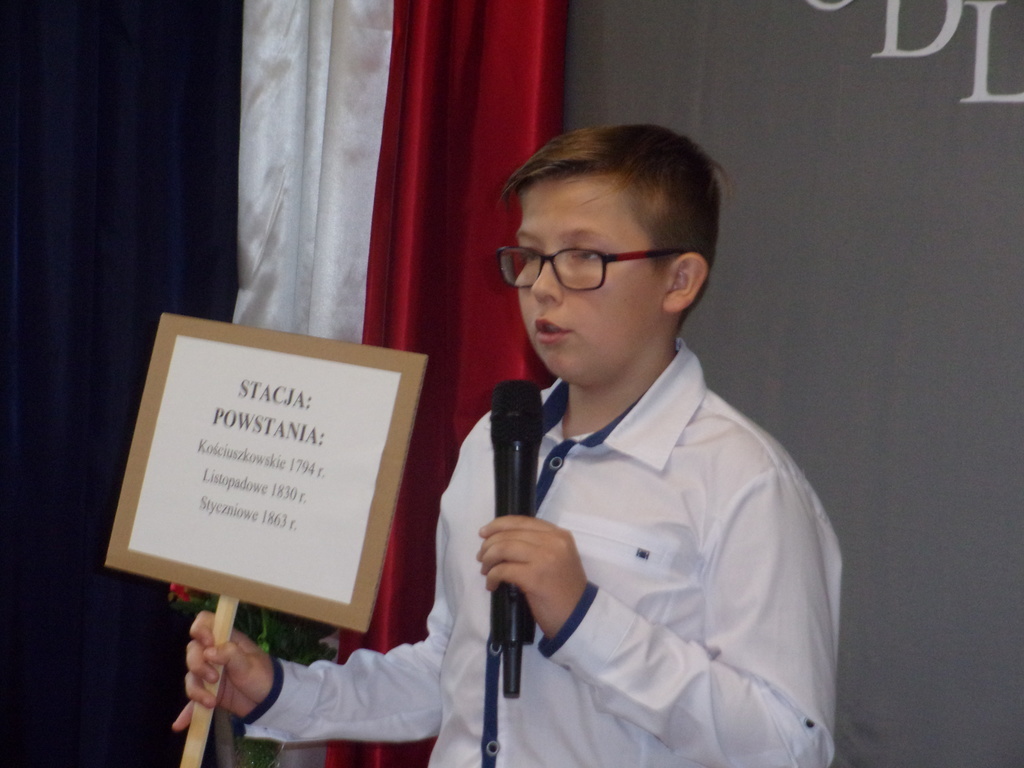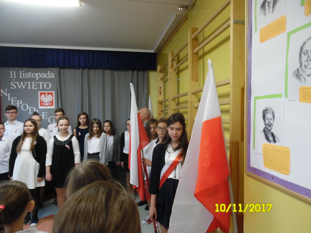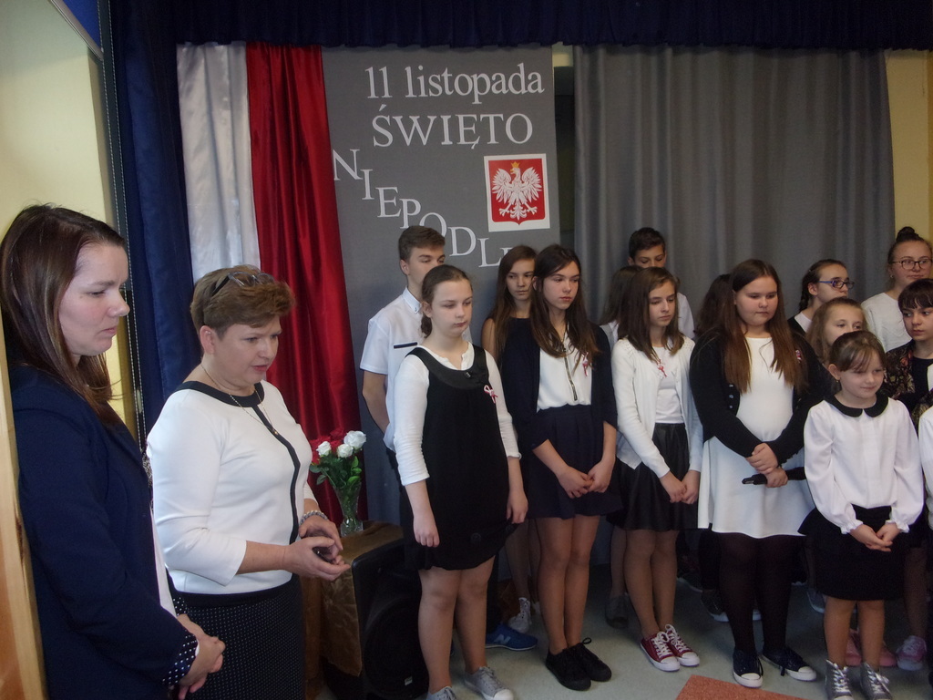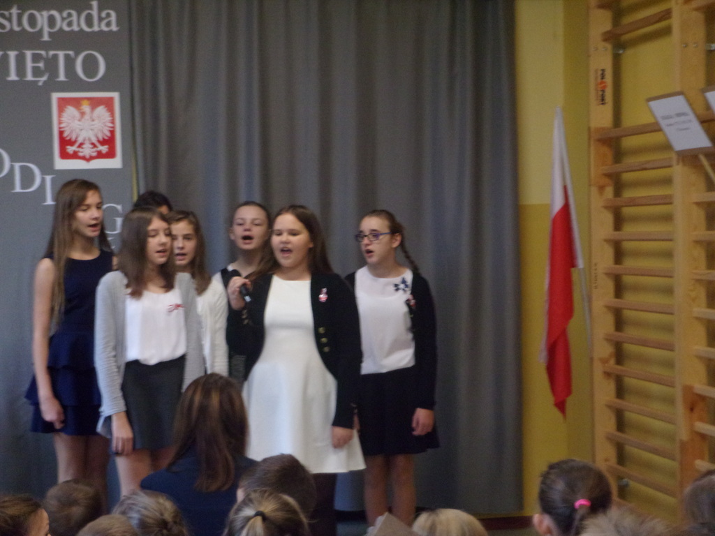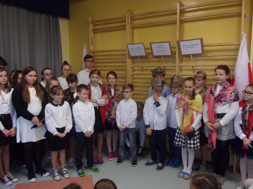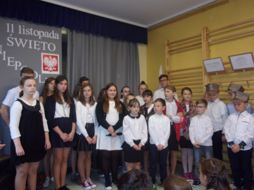 W piątek, 10 listopada br., w naszej szkole odbyła się uroczysta akademia z okazji Święta Niepodległości - 99. rocznicy odzyskania przez Polskę niepodległości. Uczniowie klas: II, IV, VI i VII pod opieką p. R. Maciejewskiej przygotowali i zaprezentowali montaż słowno-muzyczny poświęcony tematyce odzyskania przez naszą Ojczyznę niepodległości po 123 latach niewoli. Były znane wiersze oraz pieśni patriotyczne, żołnierskie oraz legionowe. Szczególnie pięknie zaprezentowali się uczniowie klasy IV, którzy w czapkach rogatywkach oraz uczennice w kolorowych chustach zaśpiewali pieśń legionową "Przybyli ułani". Uroczystość zakończyła się współczesną deklaracją patriotyzmu - wspólnym wypowiedzeniem słów z refrenu piosenki Maryli Rodowicz "Ja to mam szczęście, że w tym momencie żyć mi przyszło w kraju nad Wisłą".
