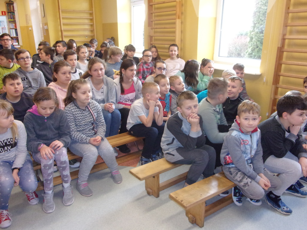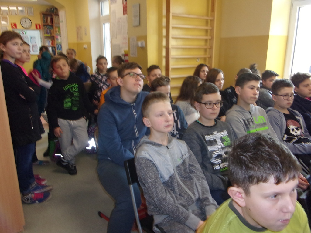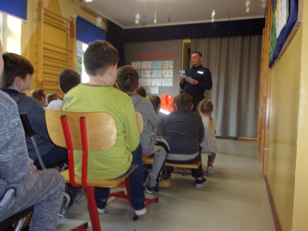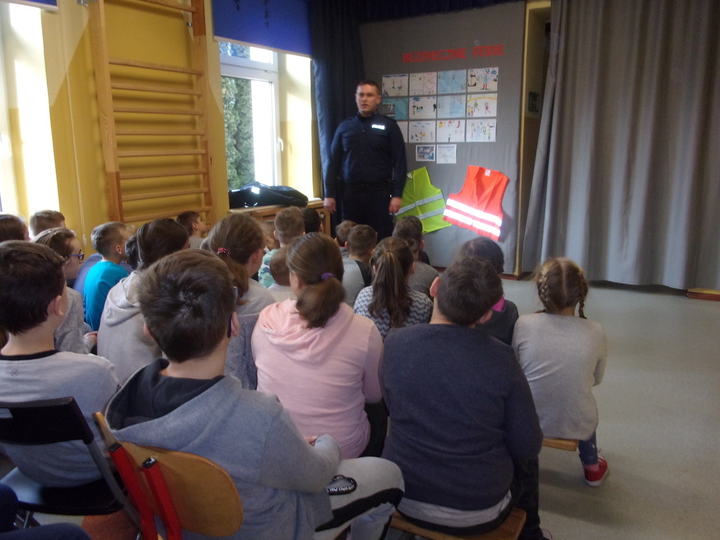 Jak bezpiecznie spędzić ferie? Na ten temat odbyło się spotkanie z młodszym aspirantem Patrykiem Szymańskim.