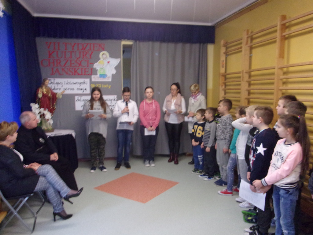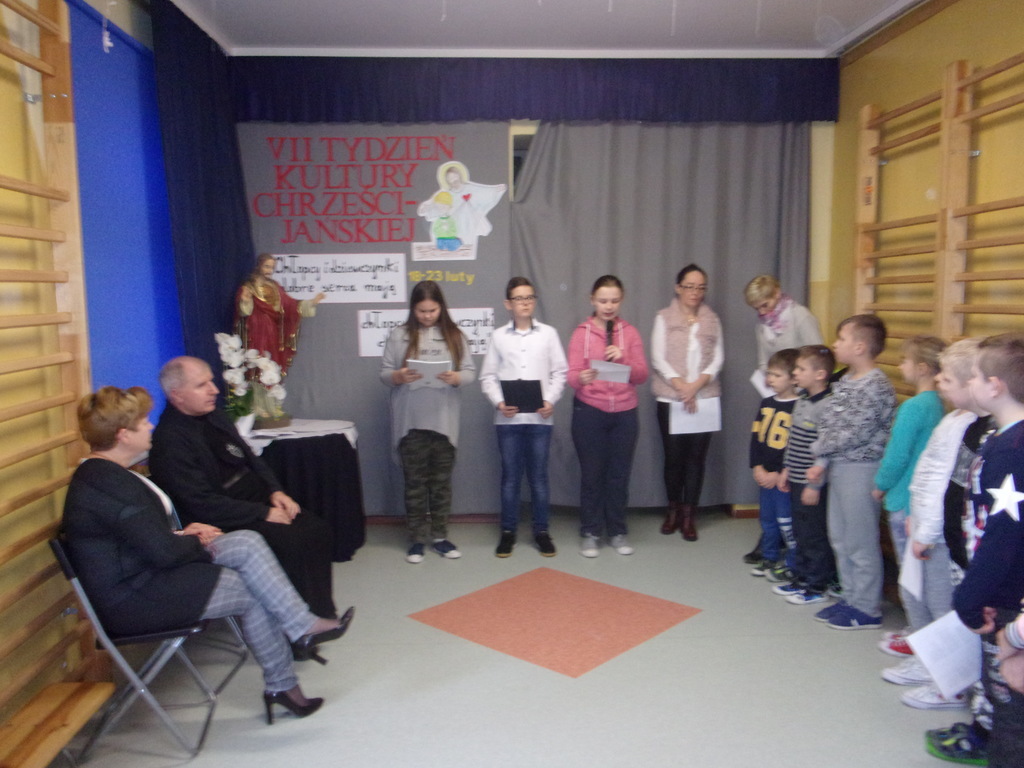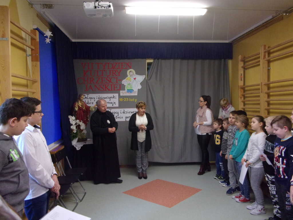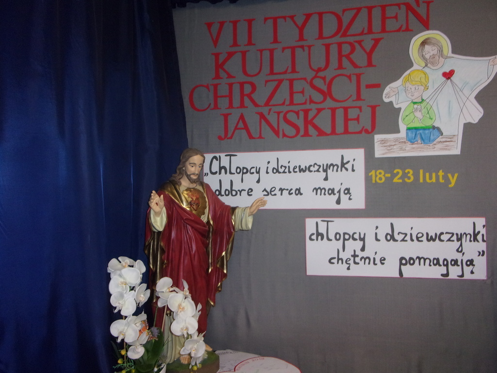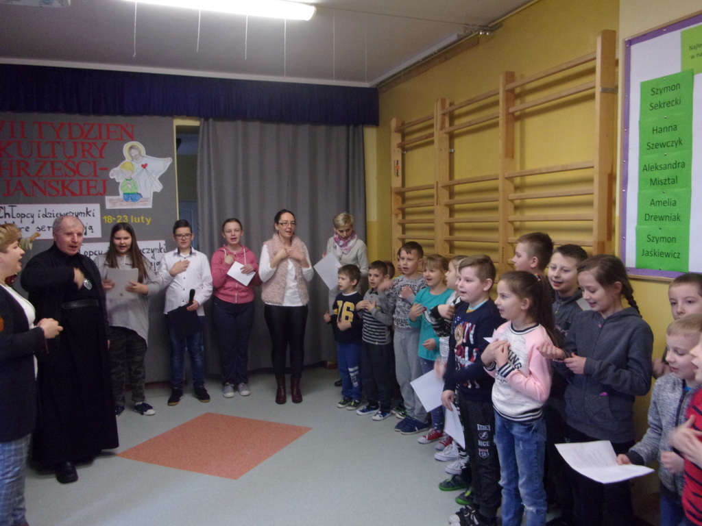 Już po raz siódmy w naszej szkole odbywa się Tydzień Kultury Chrześcijańskiej. Został zainaugurowany w niedzielę, 18 lutego br., podczas Mszy św. w intencji społeczności całej szkoły, ze szczególnym błogosławieństwem dla dzieci uczących się w naszej szkole. W poniedziałek 19 lutego obchody TKCH zostały rozpoczęte w szkole. Z tej okazji do szkoły przybył o. Jerzy Chrzanowski, pasjonista z rawskiego małego kościółka, który od siedmiu już lat współpracuje z naszą szkołą w realizacji założeń kolejnych Tygodni Kultury Chrześcijańskiej. W poprzednich latach była mowa między innymi o: Biblii, 10 przykazaniach, kościołach, działalności misyjnej. W tym roku hasło brzmi: "Chłopcy i dziewczynki dobre serca mają, chłopcy i dziewczynki zawsze pomagają". Uczniowie klasy VI pod opieką pani katechetki Ewy Gabryszewskiej-Nogaj zaprezentowali krótki program poetycki mówiący o miłości i potrzebie czynienia dobra w życiu. Wierszom towarzyszył śpiew pieśni religijnych wszystkich uczniów i nauczycieli przy akompaniamencie gitary w wykonaniu pani Pauliny Białek. W następnych dniach uczniowie będą się zmagać z religijnymi krzyżówkami, relaksować przy kolorowaniu rysunków o tematyce religijnej, obejrzą przedstawienie o pewnej Dorotce Niedobrotce zaprezentowane przez najmłodszych uczniów szkoły. Wszystkie dokonania z całego tygodnia zostaną podsumowane w piątek podczas Drogi Krzyżowej w małym kościółku. R.M.