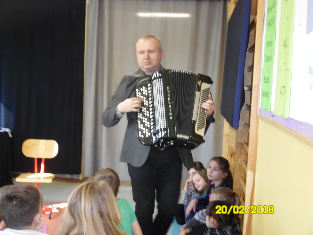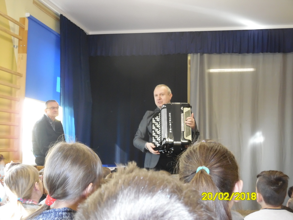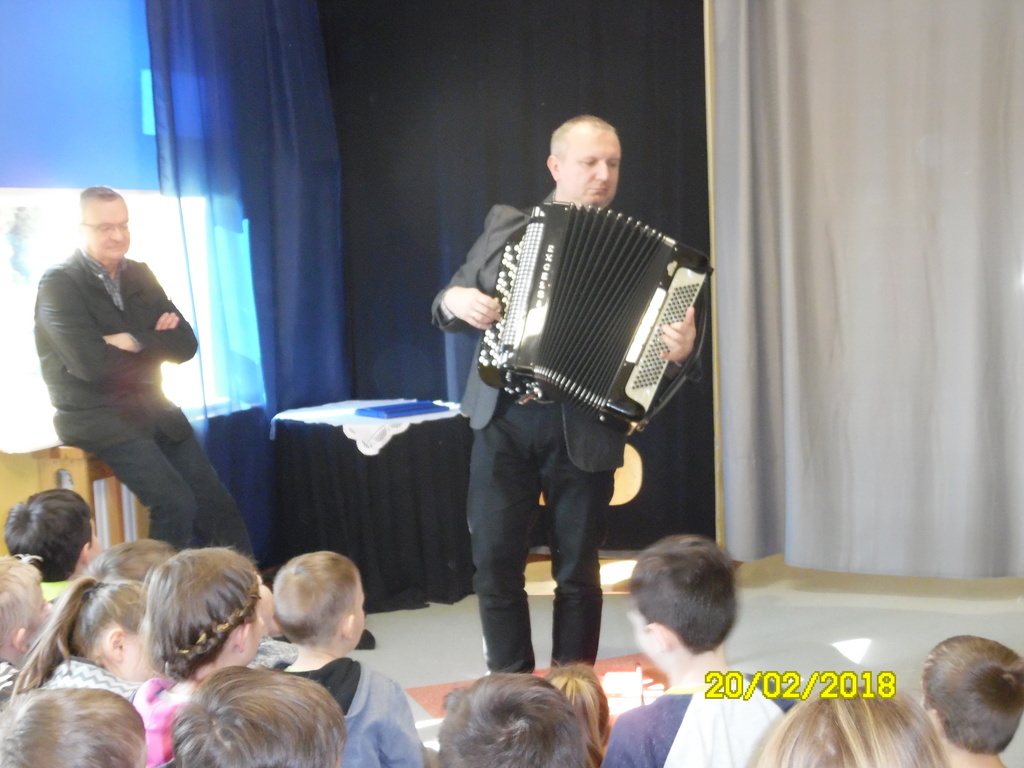 Za nami kolejny już koncert. Tym razem gościliśmy aktora, pana Włodzimierza Adamskiego, znanego m.in. z telenoweli "Pierwsza miłość", który opowiedział o pracy na scenie i przed kamerą. Pokazał uczniom ćwiczenie aktorskie na koncentrację uwagi i pamięć. Na zakończenie koncertu wystąpił prowadzący - pan Andrzej Ceglarek, który opowiedział i pokazał, jak jest zbudowany akordeon i dał pokaz swojej gry na tym instrumencie.