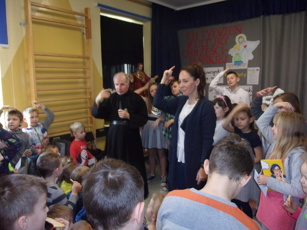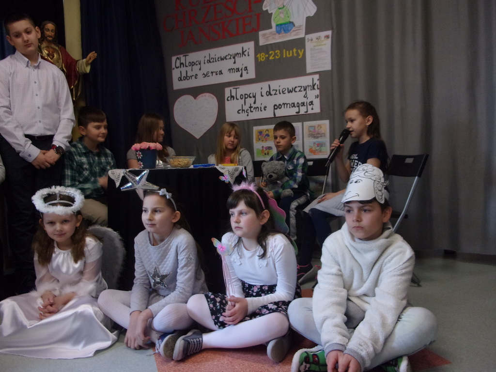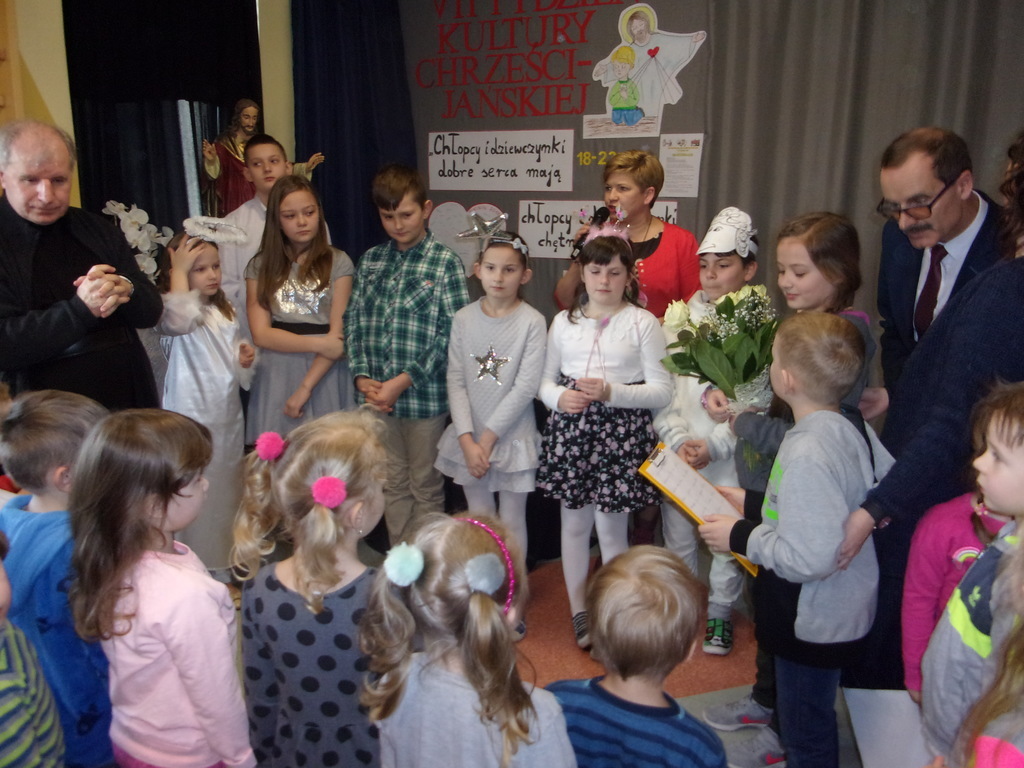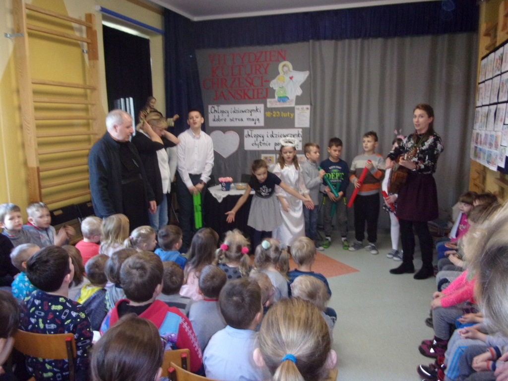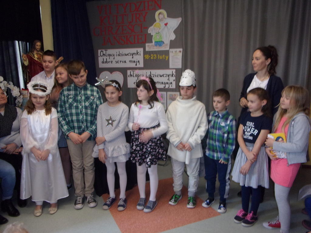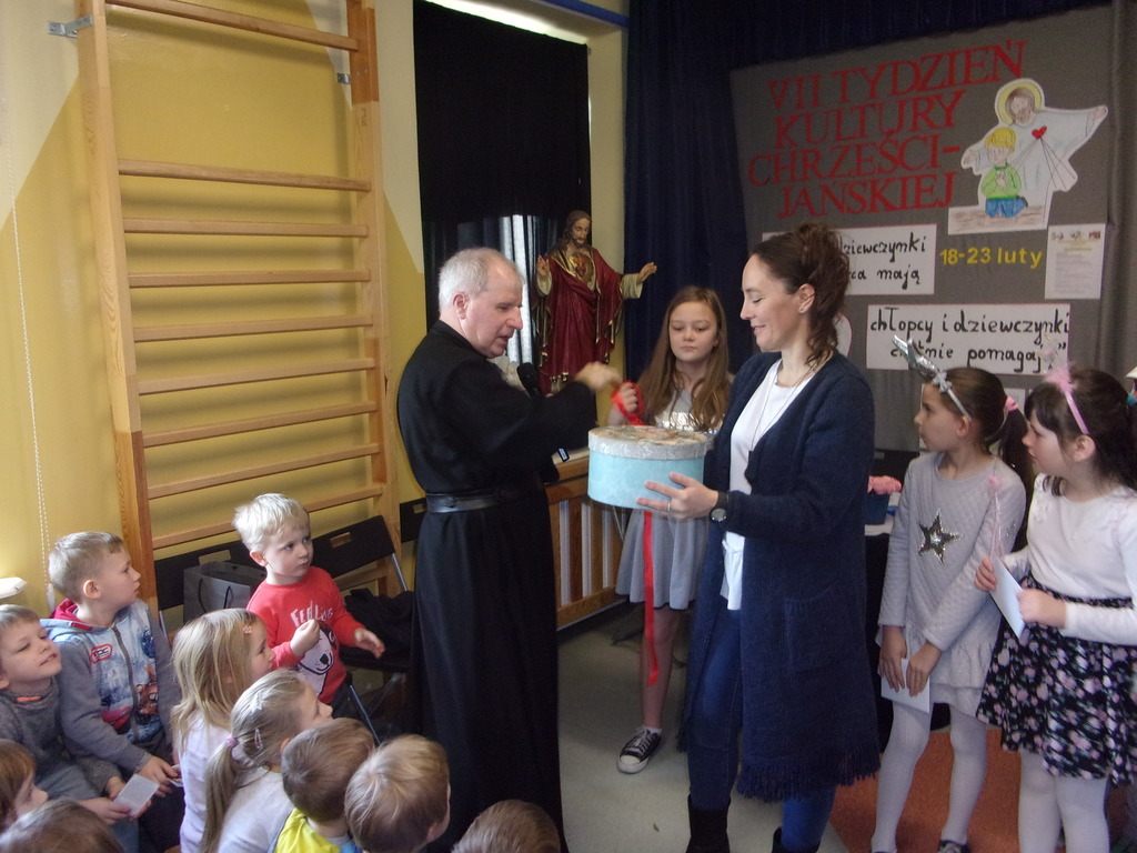 W czwartek, 22 lutego br., w naszej szkole w ramach VII Tygodnia Kultury Chrześcijańskiej uczniowie klas I-III wystąpili w przedstawieniu "O Dorotce Niedobrotce". W tytułową rolę świetnie wcieliła się drugoklasistka Ola Gąsiorowska. Mali aktorzy pokazali, jak może się zmienić dziecko pod wpływem dobrych istot, które spotyka na swojej drodze. Inscenizację przygotowała z dziećmi pani katechetka Ewa Gabryszewska-Nogaj.Wśród oglądających przedstawienie był o. Jerzy Chrzanowski, który na zakończenie przekazał wszystkim uczniom, nauczycielom i pracownikom szkoły niespodziankę - ciasteczka w kształcie serca. Cała uroczystość zakończyła się wspólną modlitwą i śpiewem. R.M.