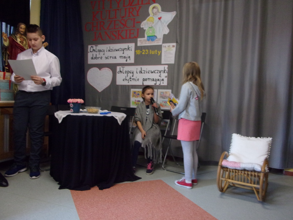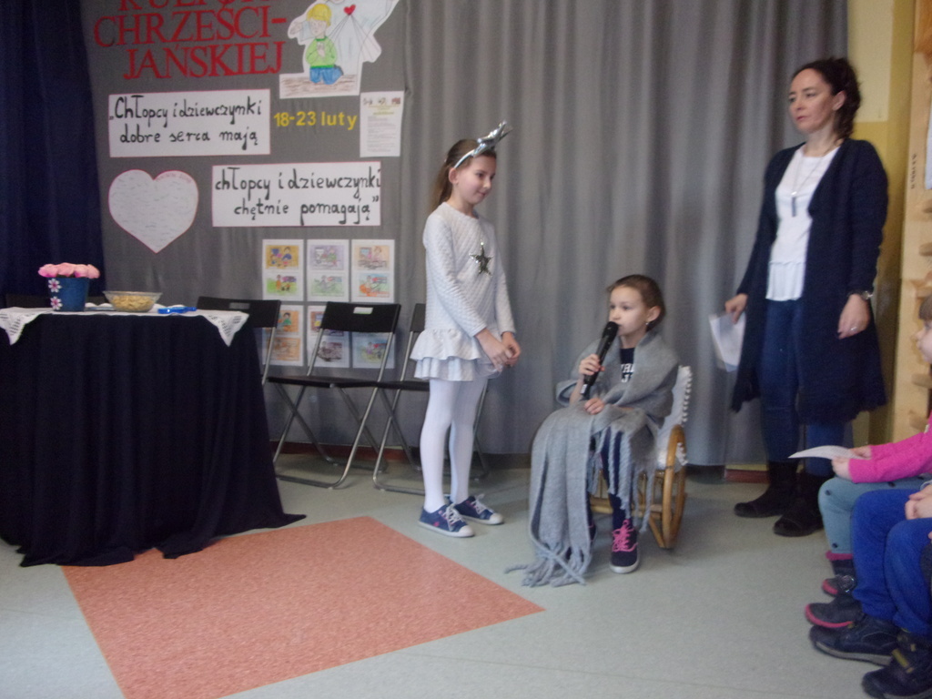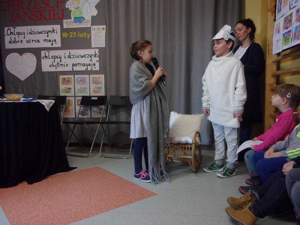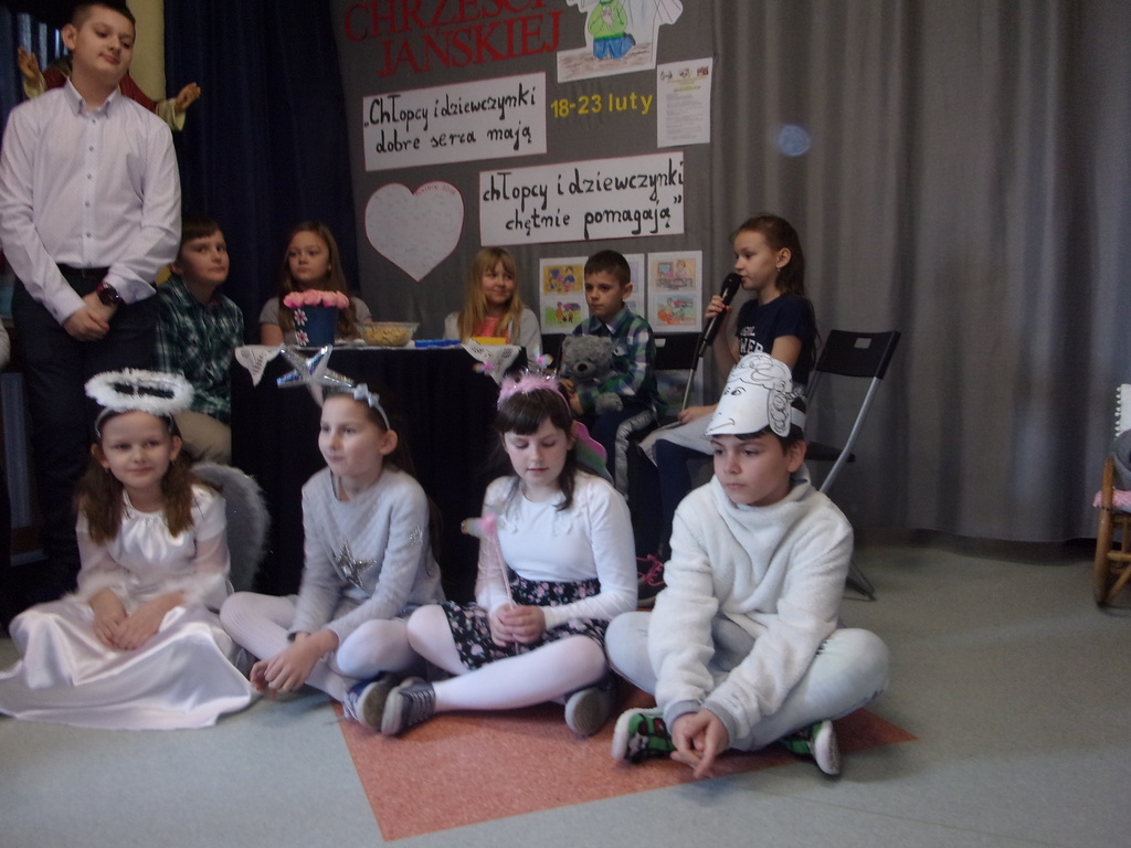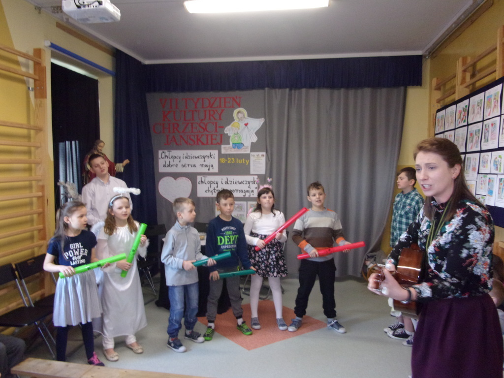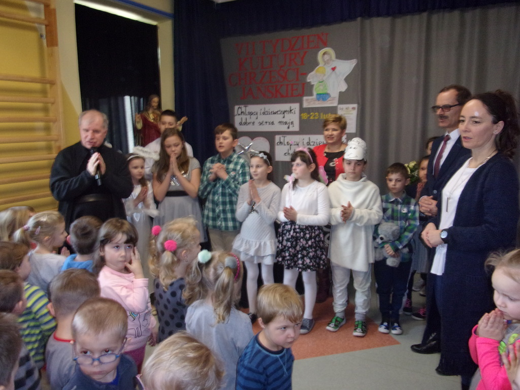 W czwartek, 22 lutego br., w naszej szkole w ramach VII Tygodnia Kultury Chrześcijańskiej uczniowie klas I-III wystąpili w przedstawieniu "O Dorotce Niedobrotce". W tytułową rolę świetnie wcieliła się drugoklasistka Ola Gąsiorowska. Mali aktorzy pokazali, jak może się zmienić dziecko pod wpływem dobrych istot, które spotyka na swojej drodze. Inscenizację przygotowała z dziećmi pani katechetka Ewa Gabryszewska-Nogaj.Wśród oglądających przedstawienie był o. Jerzy Chrzanowski, który na zakończenie przekazał wszystkim uczniom, nauczycielom i pracownikom szkoły niespodziankę - ciasteczka w kształcie serca. Cała uroczystość zakończyła się wspólną modlitwą i śpiewem. R.M.