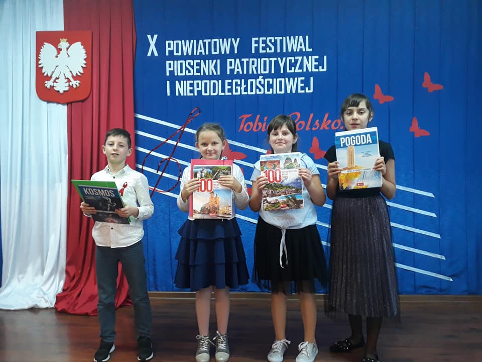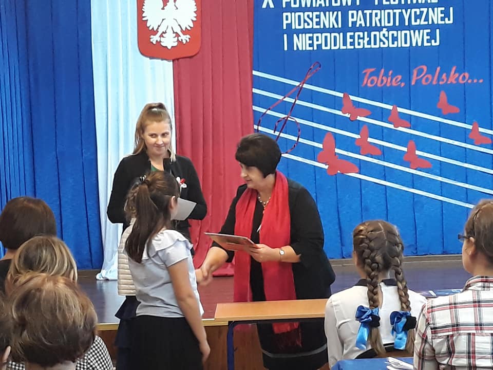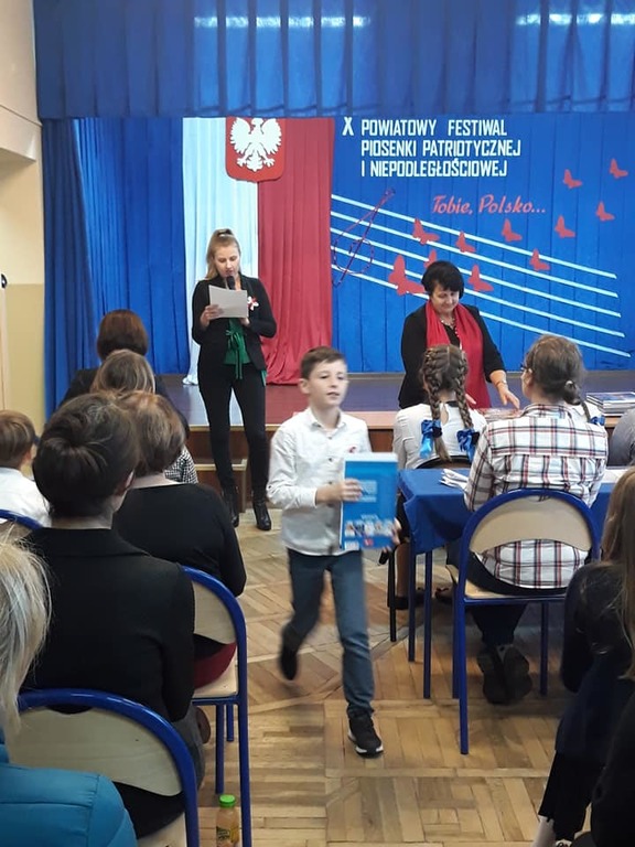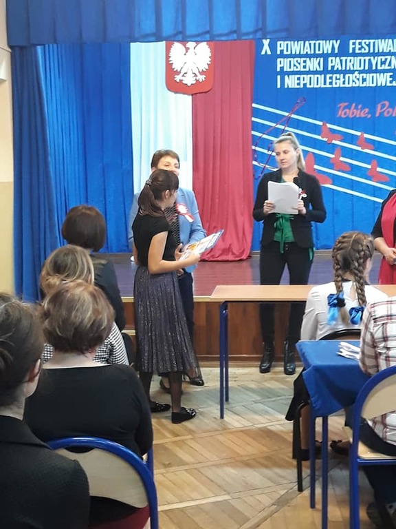 8 listopada 2018r. uczniowie naszej szkoły wzieli udział w X Powiatowym Festiwalu Piosenki Patriotycznej i Niepodległościowej "Tobie Polsko..." w Sierzchowach. Otrzymaliśmy 3 wyróżnienia oraz nagrodę Towarzystwa Przyjaciół Ziemi Sierzchowskiej.