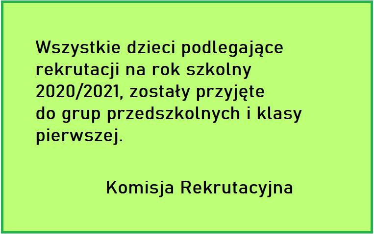 wszystkie dzieci podlegające rekrutacji na rok szkolny 2020/2021, zostały przyjęte do grup przedszkola oraz klasy I.