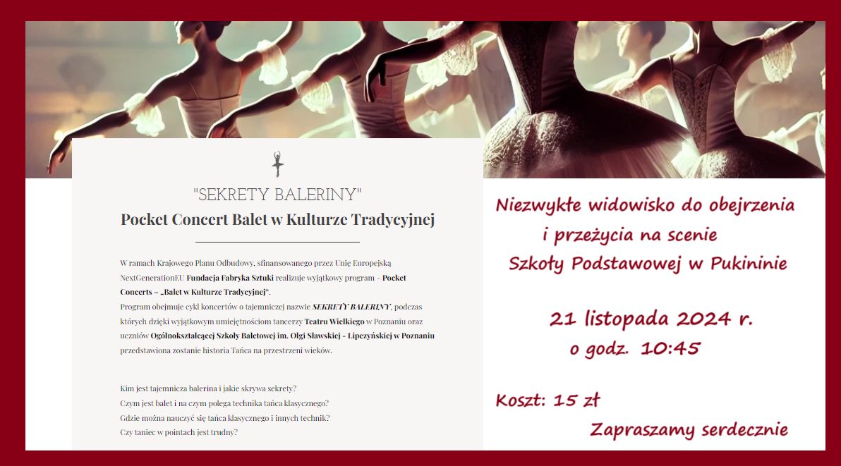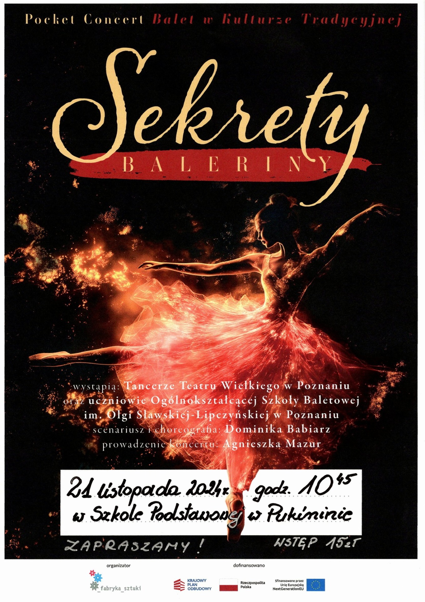 Program spektaklu obejmuje koncert o tajemniczej nazwie SEKRETY BALERINY, podczas którego dzięki wyjątkowym umiejętnościom tancerzy Teatru Wielkiego w Poznaniu oraz uczniów Ogólnokształcącej Szkoły Baletowej im. Olgi Sławskiej – Lipczyńskiej w Poznaniu przedstawiona zostanie historia Tańca na przestrzeni wieków. Koncert opowiadać będzie o tajemnicach tańca i tancerzy w kontekście zarówno historycznym jak i obyczajowym, ale opartym o kulturową tradycję. Propozycja dotyczy udziału w przedstawieniu baletowym, którego celem jest przedstawienie historii tańca