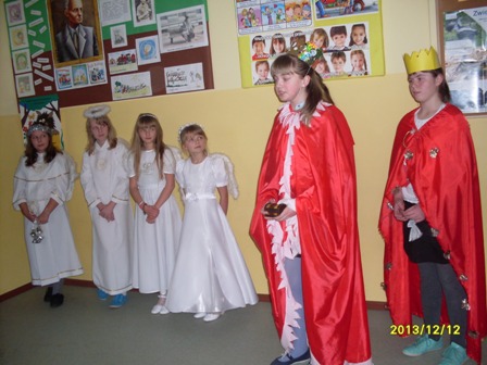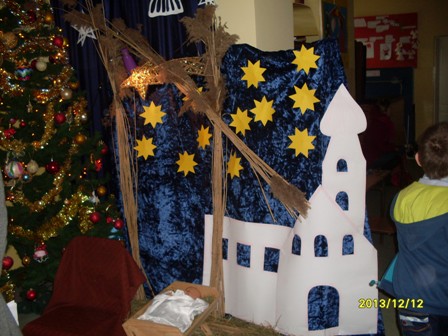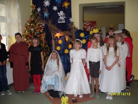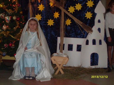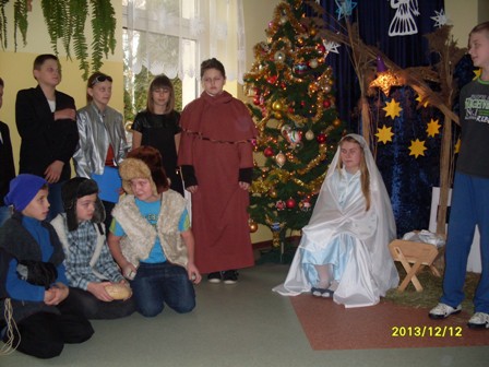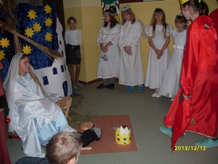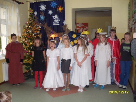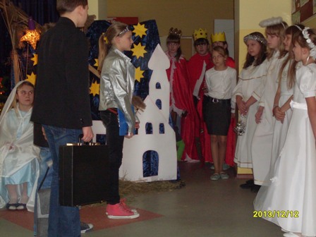Historię Narodzenia Pańskiego uczniowie przedstawili w świątecznej scenerii, w otoczeniu pięknej dekoracji bożonarodzeniowej.